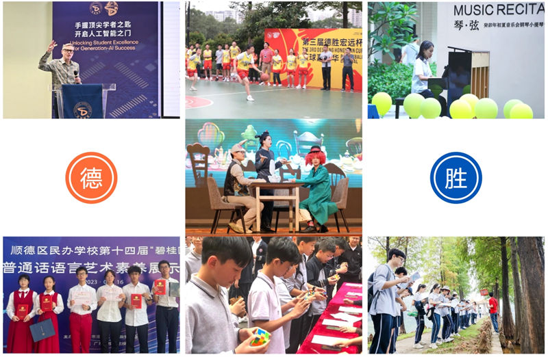 顺德德胜学校注重培养学生的文化底蕴、领袖才能、艺术修养和合作精神,学生可以在德胜大讲坛、名家进校园等大型活动中,与于丹、马伯庸、丁立梅、刘同等知名作家近距离交流。也可以通过体育文化节、科技节、读书节等校园品牌活动,以及传媒社、动漫社等学生社团活动增长知识、开阔视野,拓展技能、提升素质。