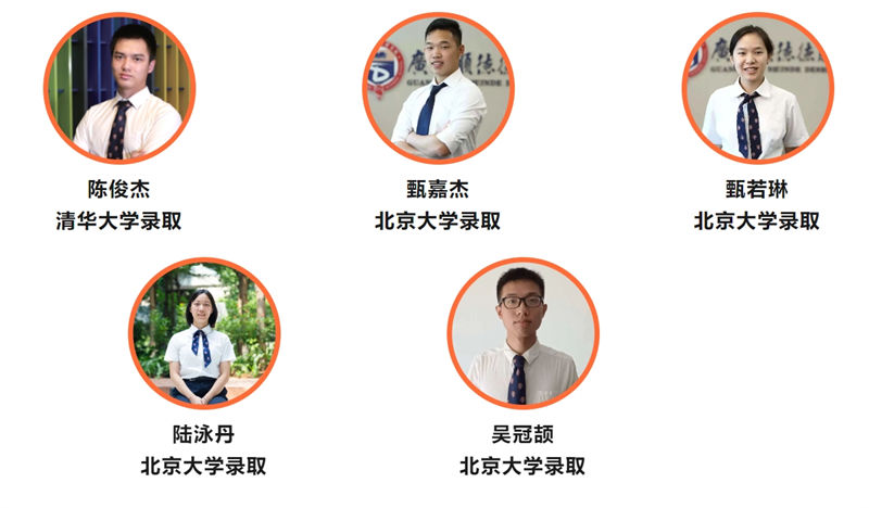 顺德德胜学校建校以来,办学成果连续二十二年区域领跑,考上卓越高中人数居市、区前列。德胜为学生提供多元成才路径,九届毕业生高考成绩优异。其中,陈俊杰被清华大学录取,甄嘉杰、甄若琳、陆泳丹、吴冠颉被北京大学录取。近百人被浙江大学、复旦大学、上海交通大学、南京大学、中国人民大学、香港大学、多伦多大学等国内外知名院校录取,多名体艺特长生通过艺术高考、传媒高考被中国传媒大学、中央戏剧学院等高校录取。此外,学生还可以通过日语高考、艺术高考、传媒高考、港澳台联考、多伦多大学绿色通道等途径进入国内外一流大学深造。