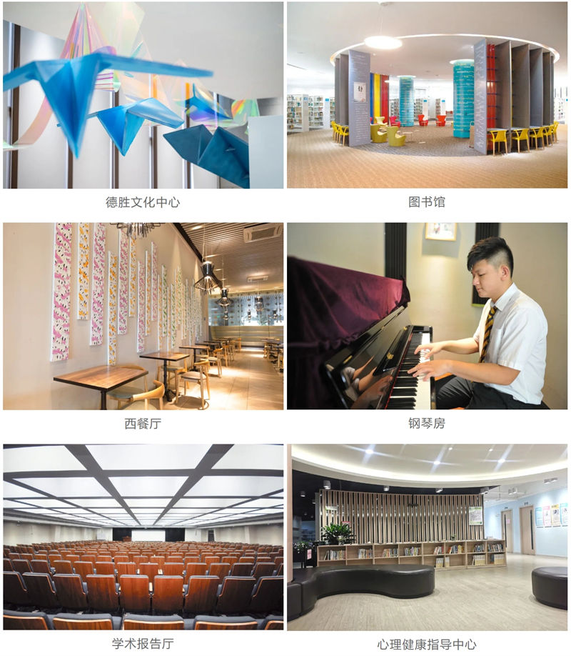 德胜校园典雅大气,占地6.4万平方米,场馆设施齐全,教学设备先进,是一所高品质、现代化、智慧型的品牌学校。建有符合国际赛事标准的五星级运动场、体育馆、篮球场等运动设施,文艺气息浓厚的德胜文化中心、图书馆、钢琴房,高规格的学生公寓、西餐厅、中餐厅、心理健康指导中心等。学校提供设备齐全的套间住宿,满足学生全宿的需求。
