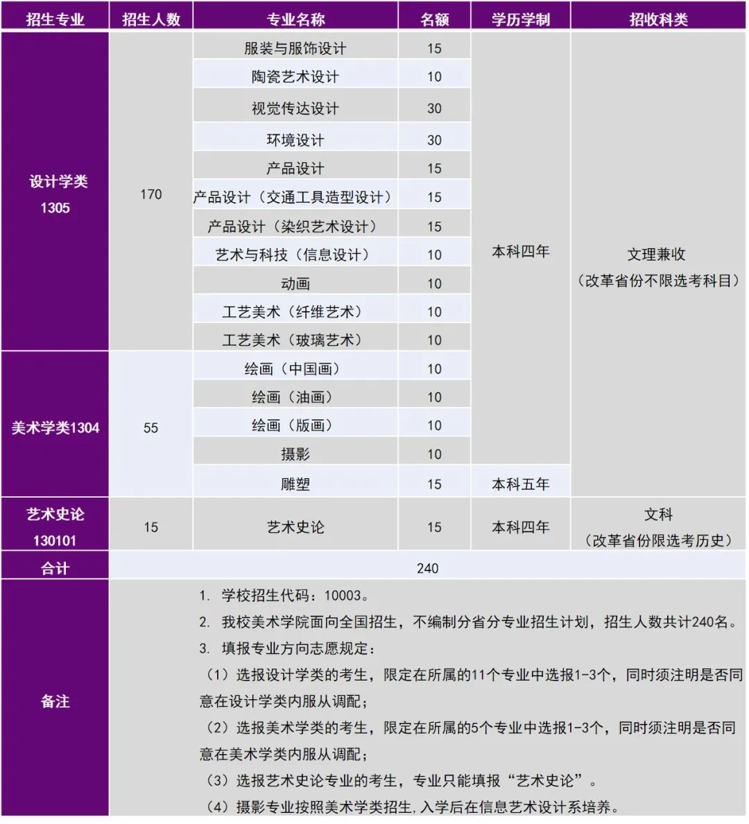4. 报考我校艺术史论专业的考生,高考科目及满分值须与所在省文史类考生一致(不分文理的省份除外),高考改革省份选考必选科目要求为历史。报考设计学类及美术学类专业的考生,高考科目不做特别要求,按照所在省教育考试院要求执行。