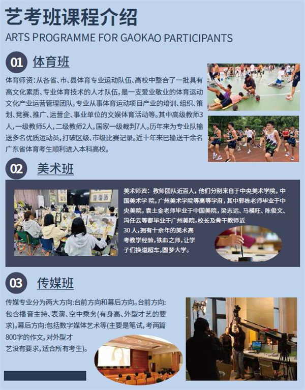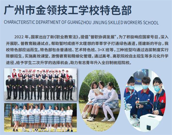 为进一步落实国家关于深入开展职、普教育融通试点政策,今年秋季开始,学校特设立特色部,推行享誉全国的黄冈教育模式,大力引进黄冈名师团队来校执教,采用黄冈先进教育管理手段,强化普通班、艺考班、3+X 班等学生的文化课程学习,为莘莘学子们进入理想的高等院校深造加油助力!