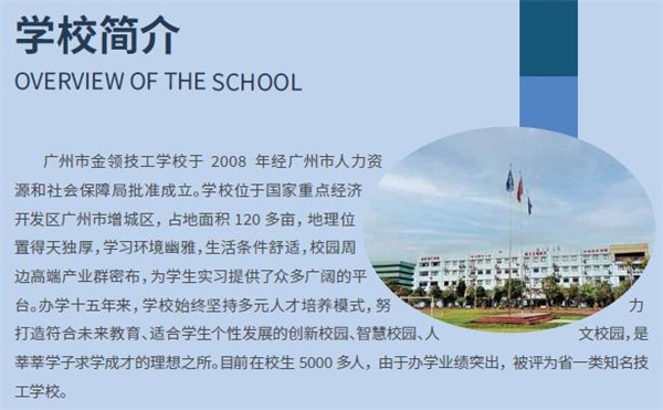 广州市金领技工学校于2008年经广州市人力资源和社会保障局批准成立。学校位于国家重点经济开发区广州市增城区,占地面积120多亩,地理位置得天独厚,学习环境幽雅,生活条件舒适,校园周边高端产业群密布,为学生实习提供了众多广阔的平台。