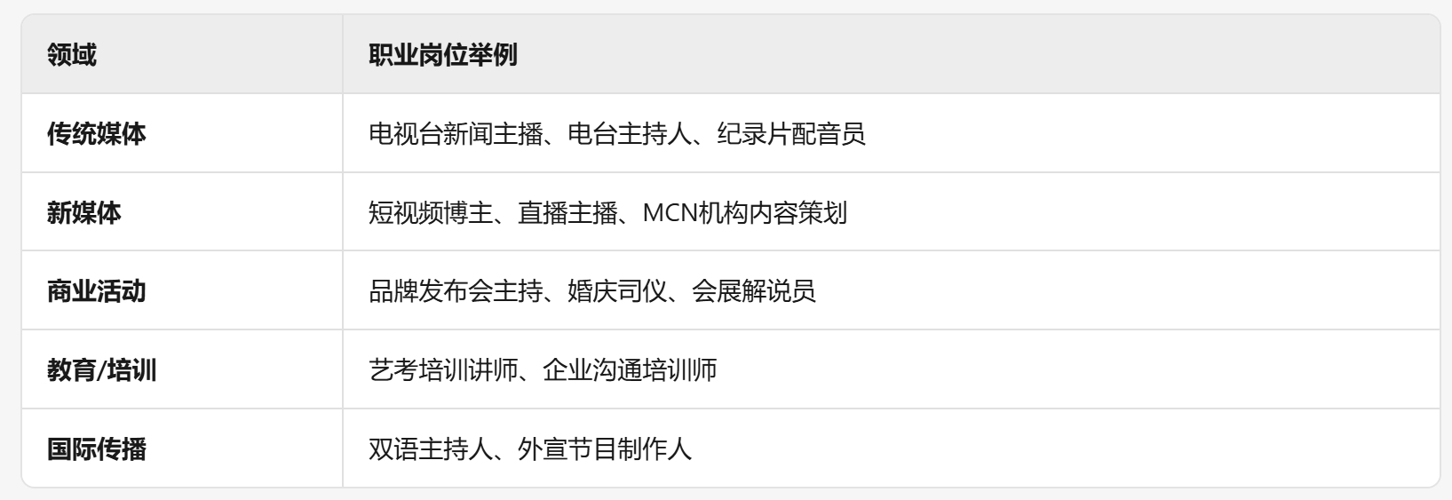 总结:播音与主持艺术已从传统广播电视扩展至新媒体、垂直领域、国际传播与技术创新,成为语言艺术与媒介融合的综合性学科。