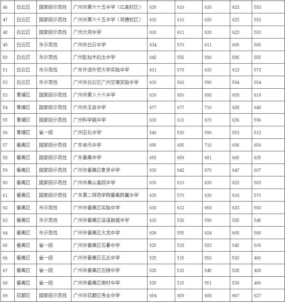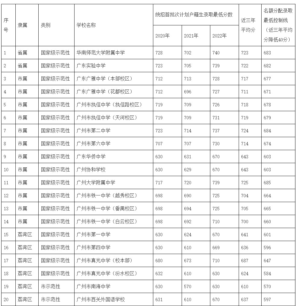 2.广东广雅中学(花都校区)2020年录取最低分数采用广东广雅中学(本部校区)录取最低控制线,广州市执信中学(天河校区)2020年、2021年采用广州市执信中学(执信路校区)录取最低控制线,广州市花都区邝维煜纪念中学(雅正校区)2020年、2021年采用广州市花都区邝维煜纪念中学(校本部)录取最低控制线;广州市铁一中学(白云校区)2020年、2021年采用广州市铁一中学(越秀校区)和广州市铁一中学(番禺校区)录取最低分数平均值;广州市第五中学(金碧校区)2020年、2021年采用原广州市第九十七中学(金碧校区)录取最低分数,广州市南武中学(岭南画派纪念校区)2020年、2021年采用原广州市岭南画派纪念中学录取最低分数;广州市培英中学(白云新城校区)、广州市培英中学(鹤洞校区)使用原广州市培英中学录取最低分数;广州市第六十五中学(江高校区)、广州市第六十五中学(同德校区)使用原广州市第六十五中学录取最低分数。