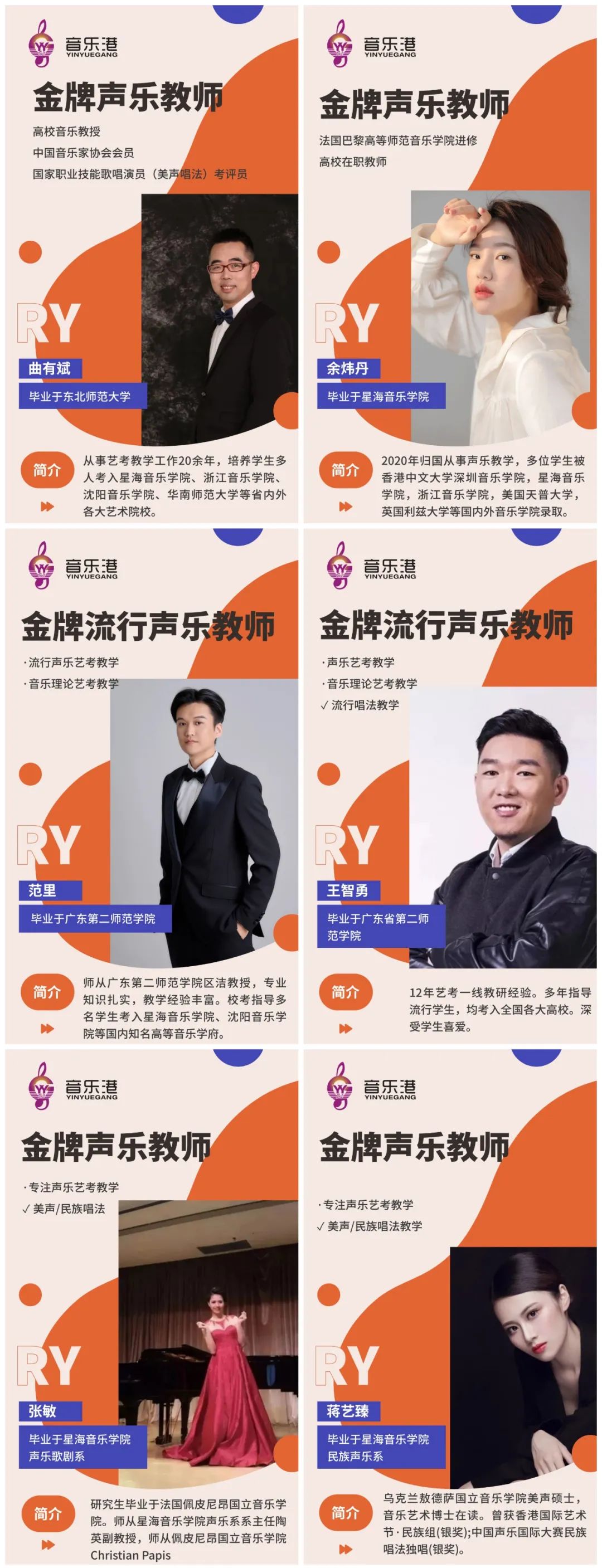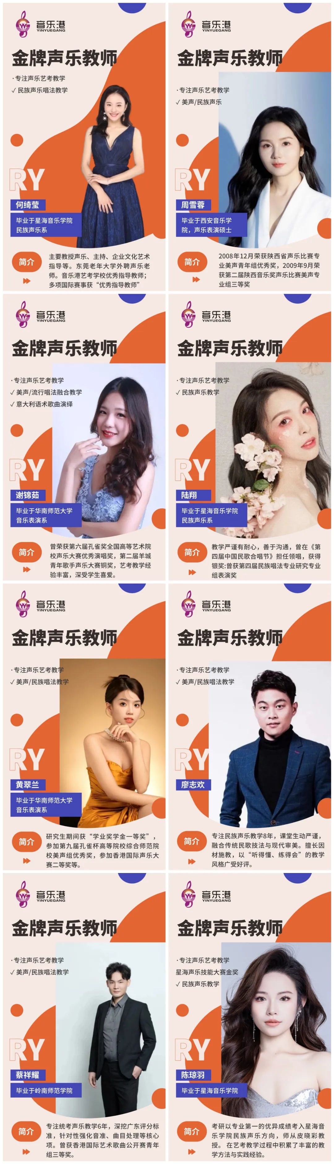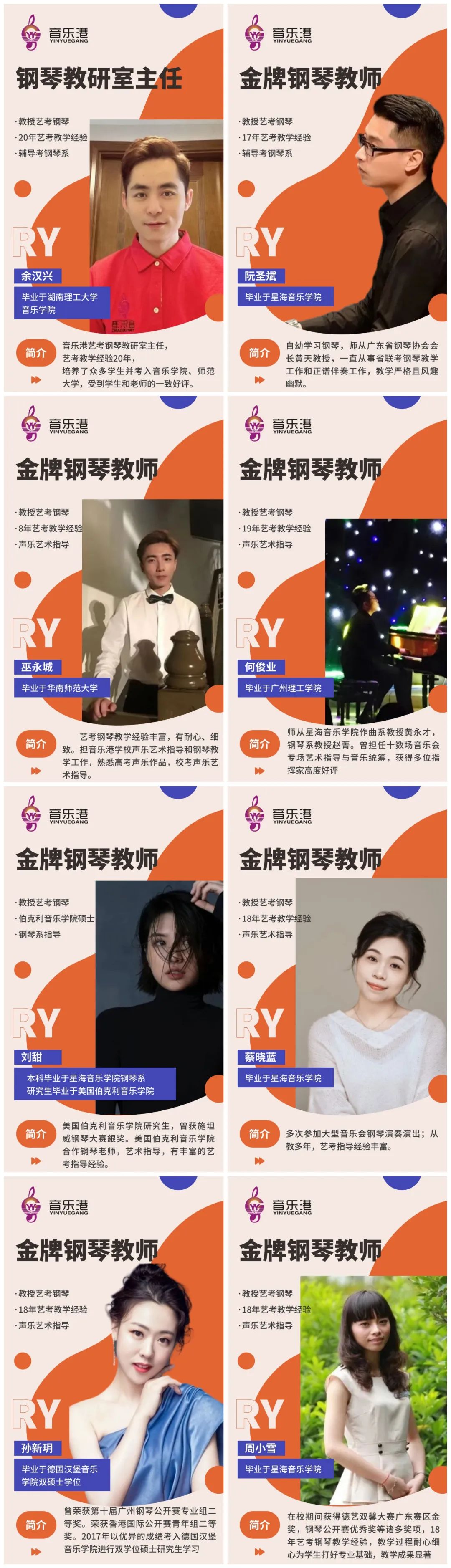 儒艺(音乐港)艺考培训机构的每一位任课老师都是经过标准、严要求筛选通过的教师。专业师资团队共计80余人,并有专职后勤老师及教务团队为学生们的学习及生活给予双重保障。均为星海音乐学院、华南师范大学、湖南师范大学等院校的本科毕业生及研究生。拥有多年艺考理论与教学相结合的实践经验。