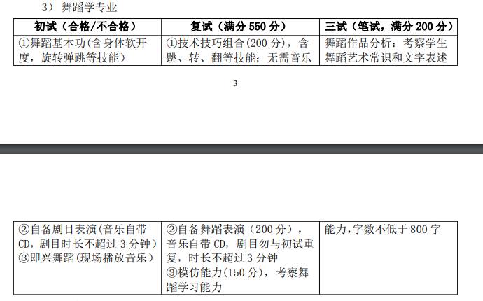 ②自备舞蹈表演(200 分), 音乐自带 CD,剧目勿与初试重 复,时长不超过 3 分钟
