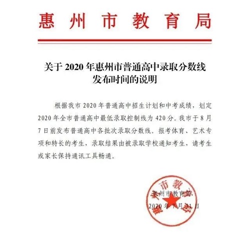 8月5日,惠州市教育局发布了2020年普通高中学校录取分数线及开展补录工作的公告。