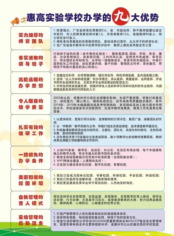 按照惠州市教育局的统一部署,2020年秋,我校招收高一新生26个教学班,共1404人,其中在惠阳区招收公办收费生728人,在惠州市内外招收民办收费生676人。