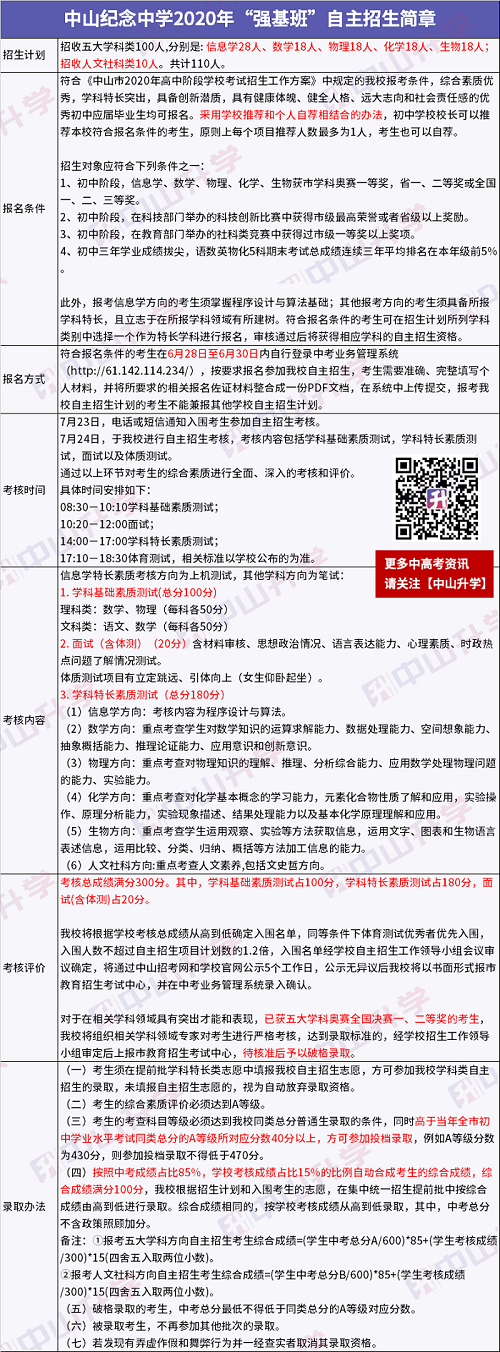 中山纪念中学2020年“强基班”自主招生简章