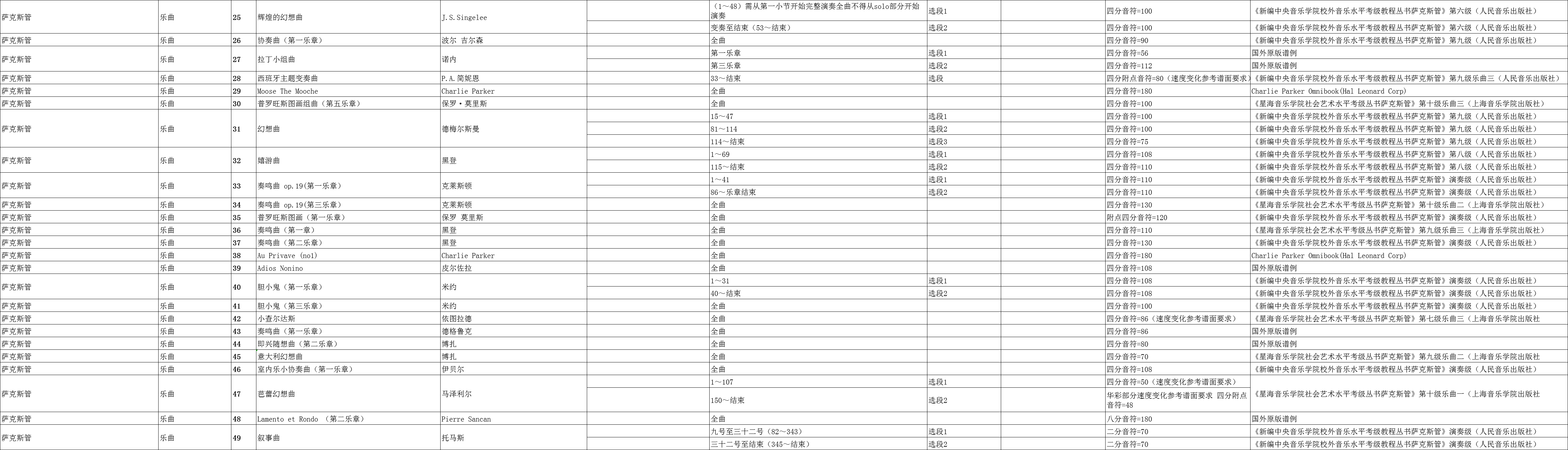 广东省音乐联考萨克斯管乐曲规定曲目