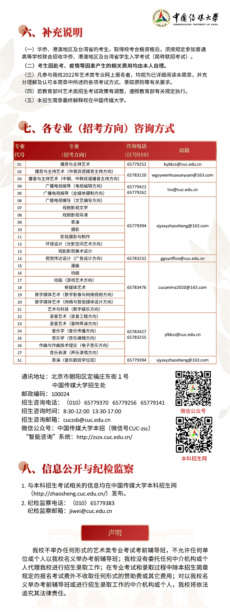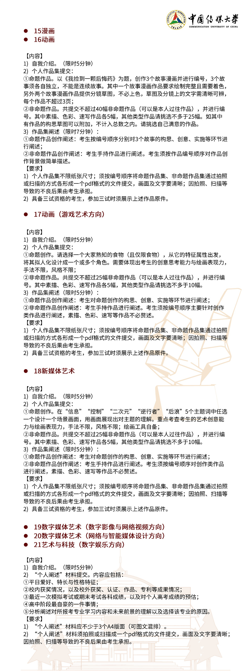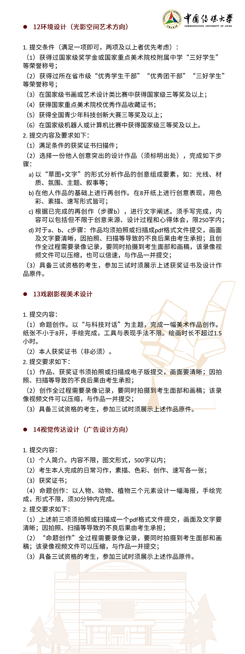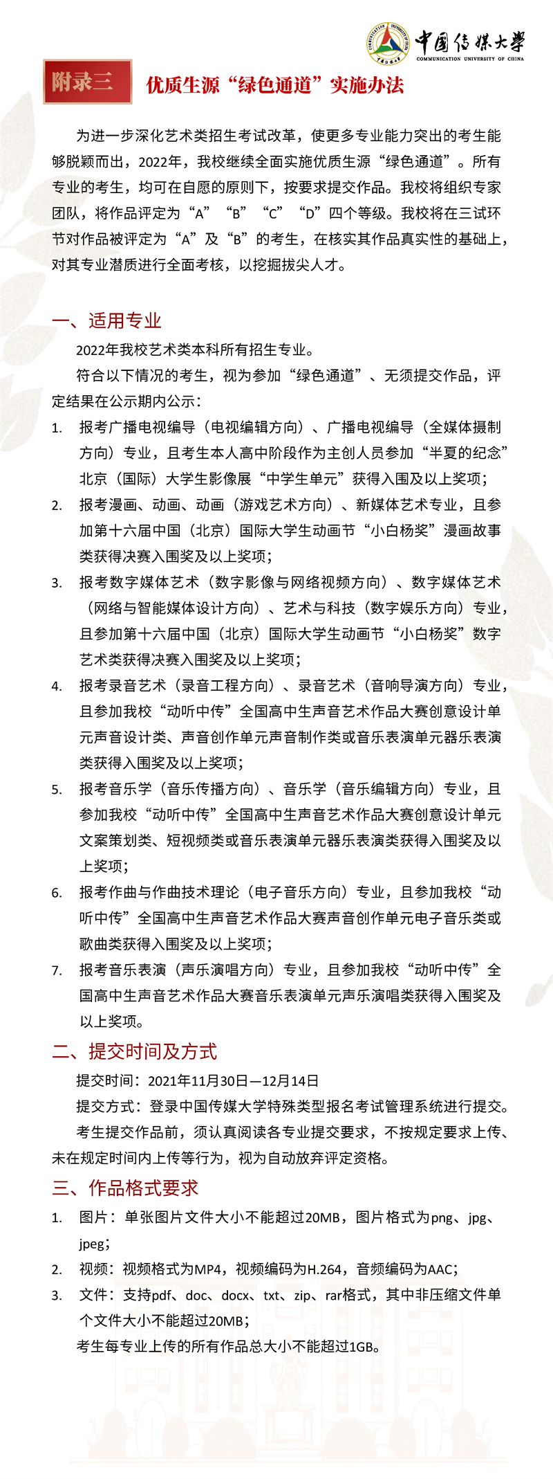 2022年,我校继续按照“独立设置本科艺术院校艺术类本科专业招生办法”面向 全国进行艺术类本科招生。本简章只限于介绍我校艺术类本科专业及招考方向的招生 情况,其他类别的招生情况另做介绍。欢迎有理想、爱传媒、有潜质的同学积极报考!