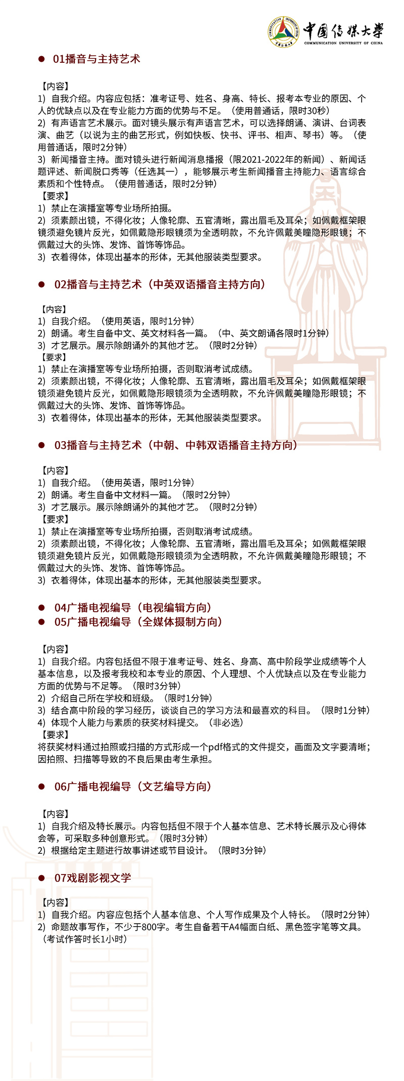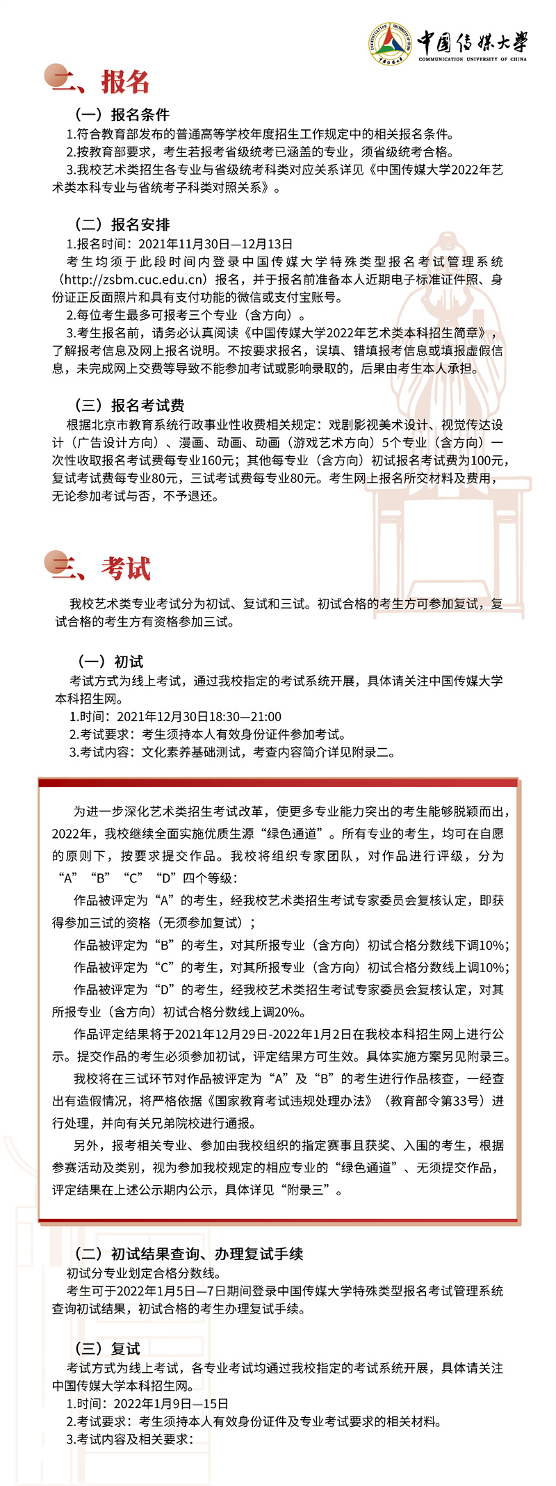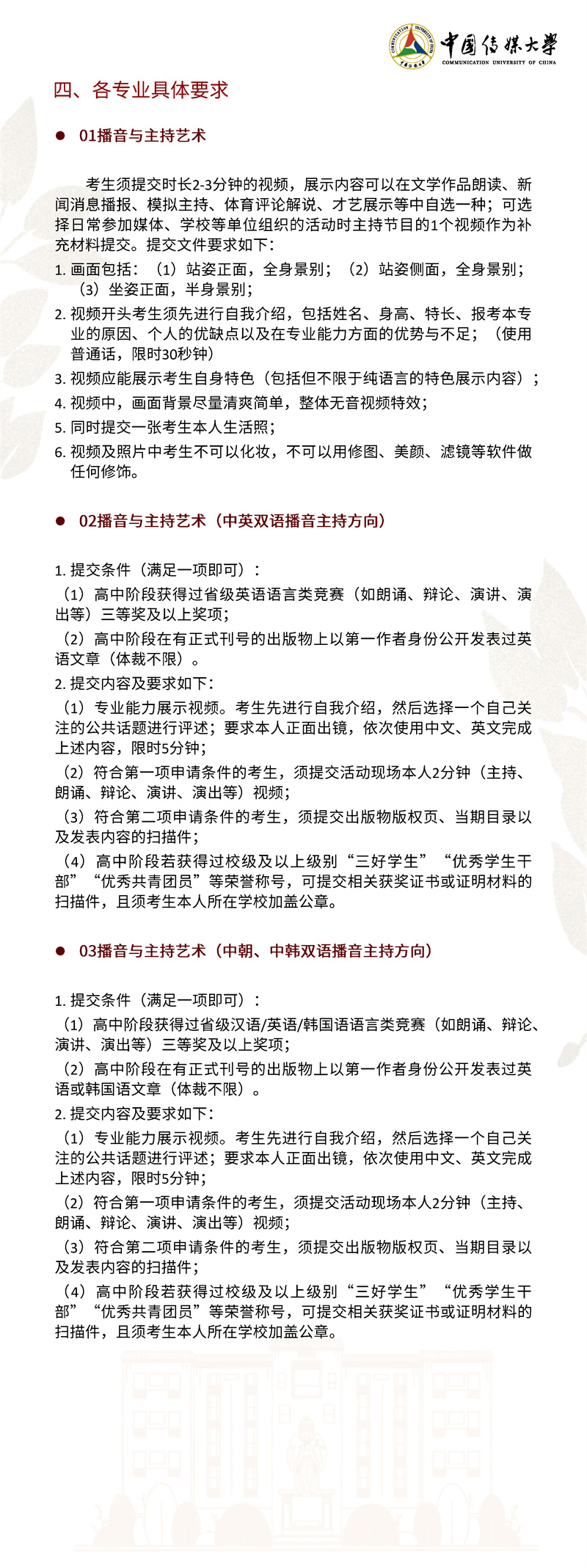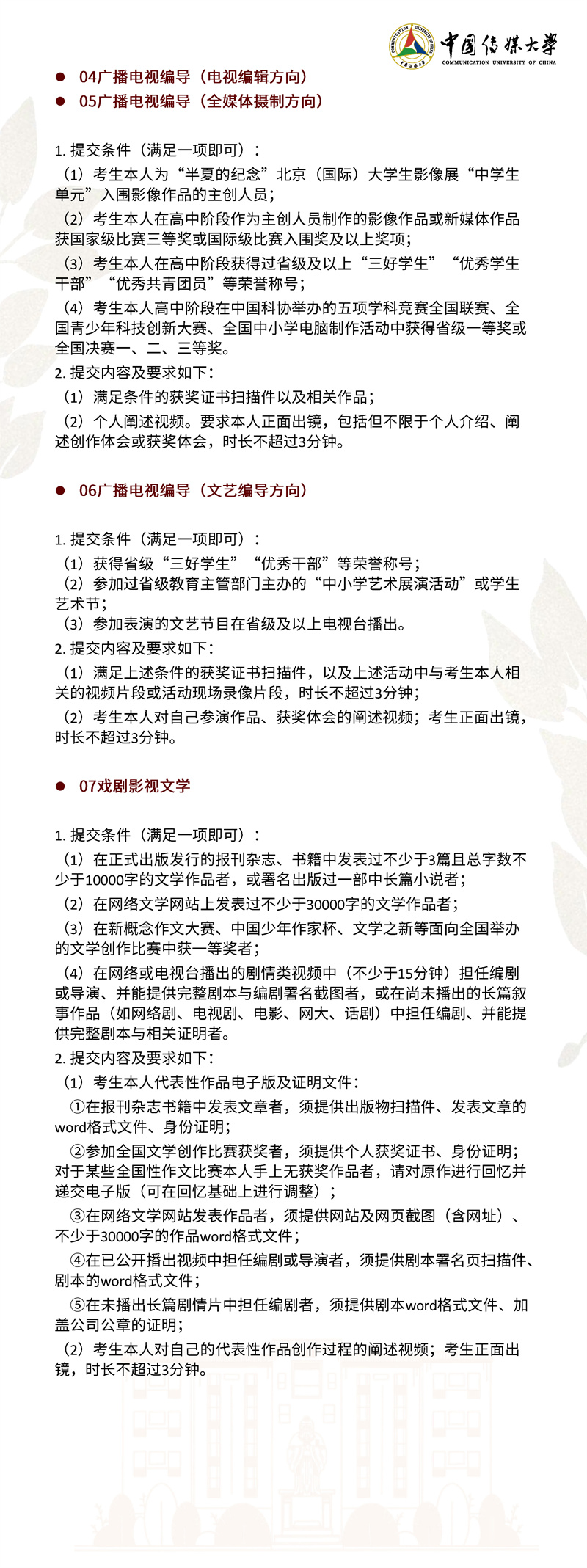 2022年,我校继续按照“独立设置本科艺术院校艺术类本科专业招生办法”面向 全国进行艺术类本科招生。本简章只限于介绍我校艺术类本科专业及招考方向的招生 情况,其他类别的招生情况另做介绍。欢迎有理想、爱传媒、有潜质的同学积极报考!