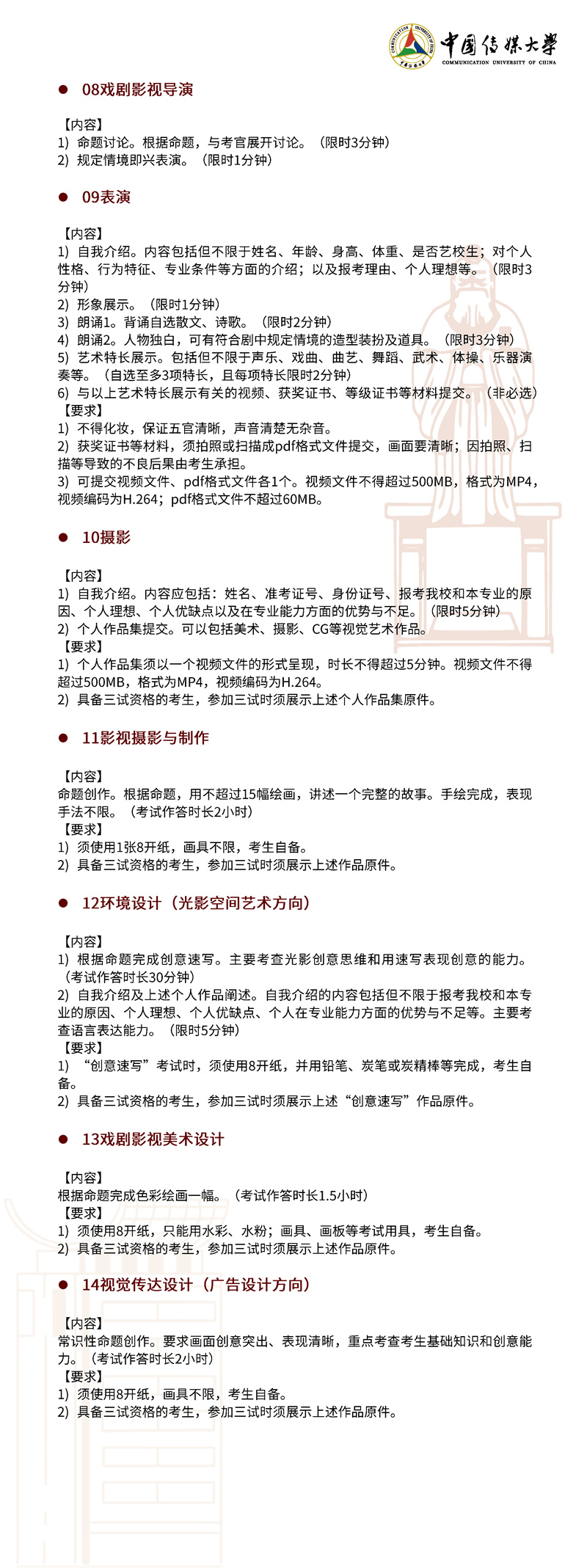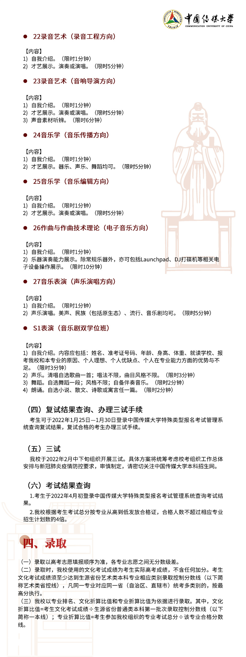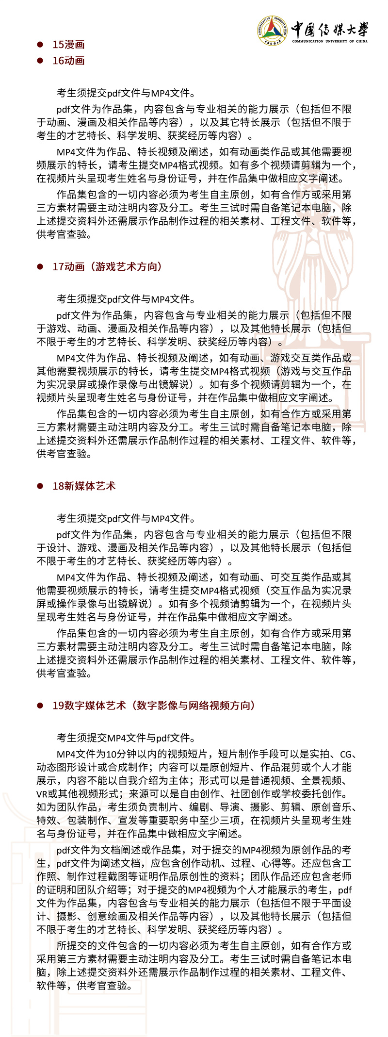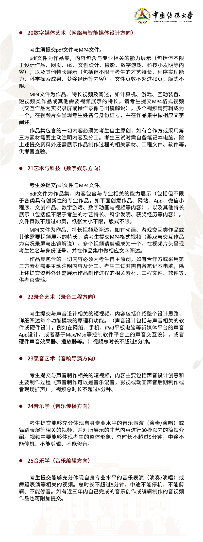 2022年,我校继续按照“独立设置本科艺术院校艺术类本科专业招生办法”面向 全国进行艺术类本科招生。本简章只限于介绍我校艺术类本科专业及招考方向的招生 情况,其他类别的招生情况另做介绍。欢迎有理想、爱传媒、有潜质的同学积极报考!