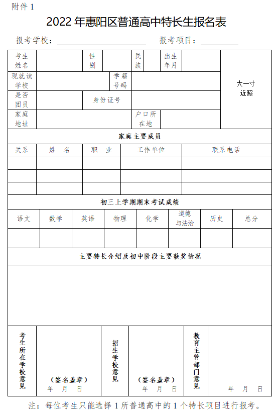 1.2022年惠阳区普通高中特长生报名表
