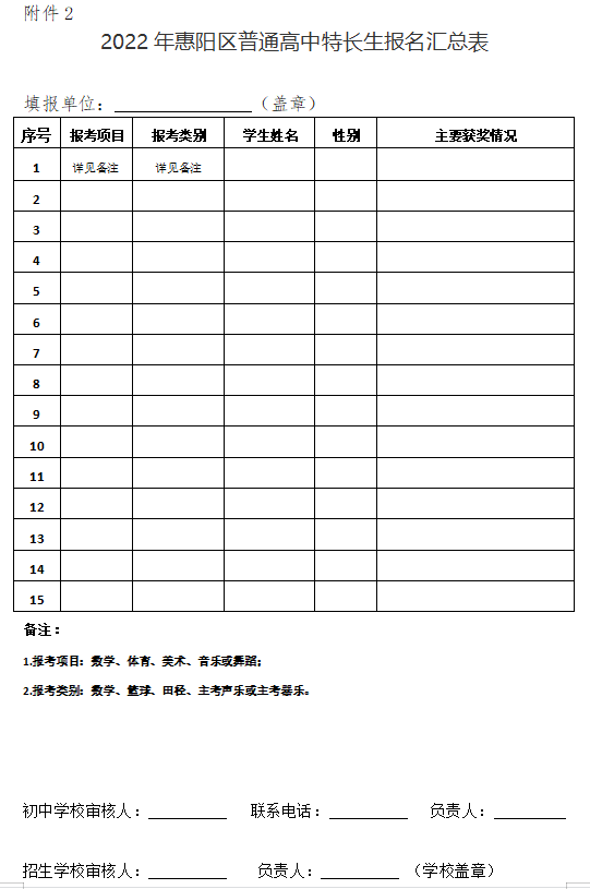 2.2022惠阳区普通高中特长生报名表汇总表