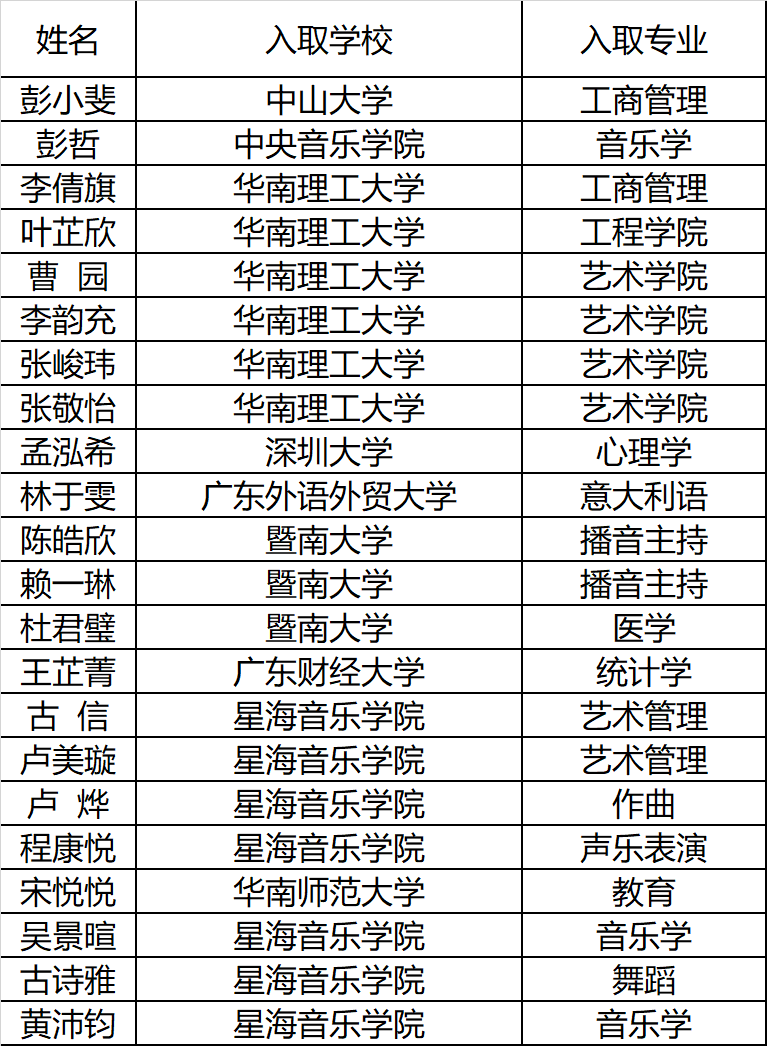 坚持文化学习与艺术特长两手抓,把我校的合唱、管弦乐特长生,培养成一专多能、品学兼优的好学生。我校合唱、管弦乐特长生可参加全国普通高等院校考试,也可以侧重向音乐学院、综合大学艺术学院、普通高等院校音乐系、戏剧学院、艺术学院、传媒大学等方向发展。历年来,我校的艺术特长生,在各种教育行政部门举办的音乐艺术展演、艺术比赛活动中,都名列前茅,为全国各大音乐院校、师范大学音乐系以及省市电视台、芭蕾舞团、交响乐团、广东省各中小学输送了一批批优秀的艺术人才。