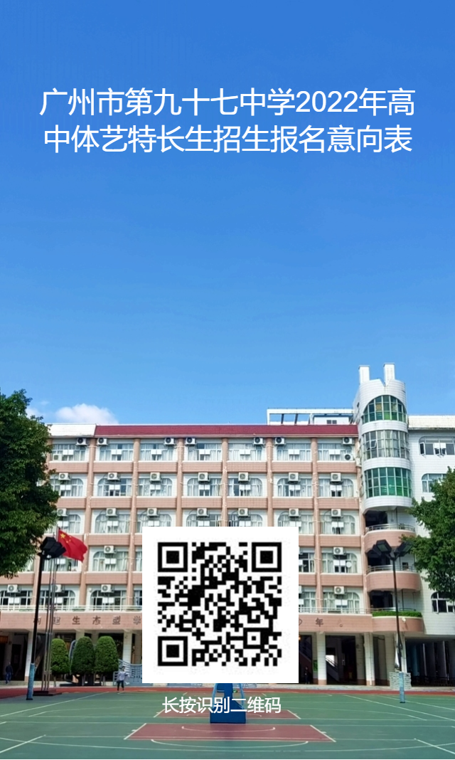 广州市第九十七中学是广州市示范性普通高中学校、广东省一级学校。根据广州市教育局《广州市教育局关于印发广州市义务阶段学校招生工作指导意见的通知》(穗教规字[2018]3号)《广州市教育局引发<关于进一步深化高中阶段学校考试招生制度改革的实施意见>的通知》(穗教规字[2018]8号)的精神,为提高我校体育、艺术教育水平,加强我校“广州市传统项目学校”“广州市中小学高水平体育团队”的建设,丰富校园文化生活,全面推进素质教育,同时也为有体育、艺术特长的学生提供继续深造的机会,带动学校运动队、艺术团持续发展,2022年我校拟招收高中体育特长生21名(篮球、排球、田径、健美操、乒乓球、定向越野),高中艺术特长16名(舞蹈、语言艺术)(具体以报考指南为准)。学校将本着公平公正的原则,对报考广州市第九十七中学的体育、艺术特长生进行选拔。