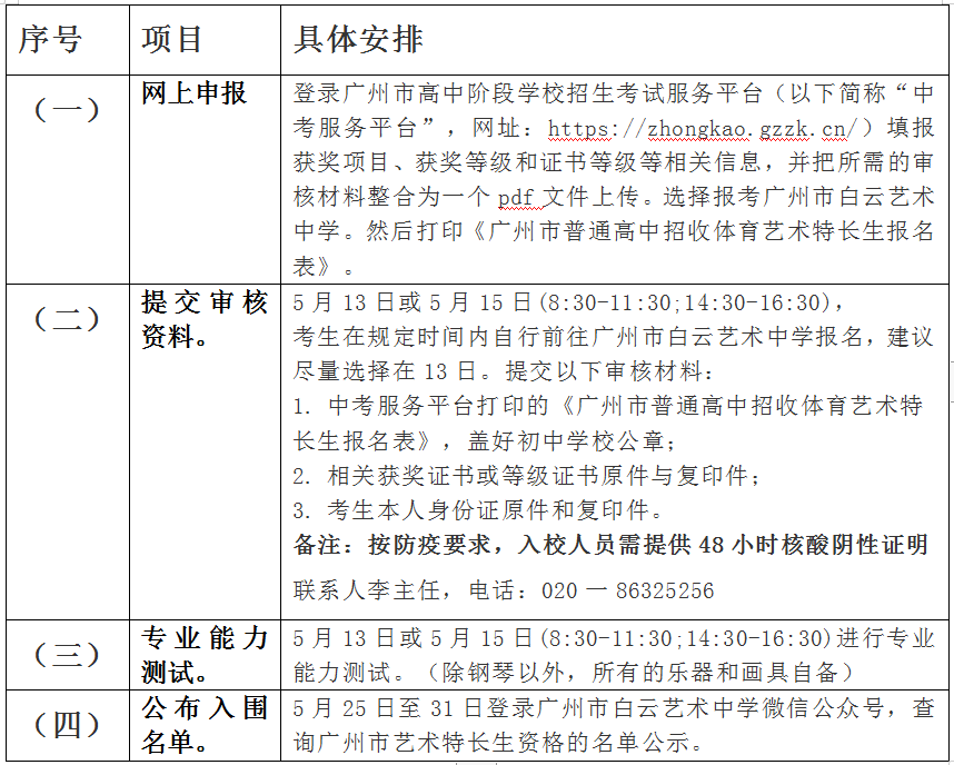 No.3 5月13日 5月13日或5月15日(8:30--11:30;14:30--16:30)在规定时间内,建议尽量选择在13日。 到广州市白云艺术中学 提交以下材料 参加面试