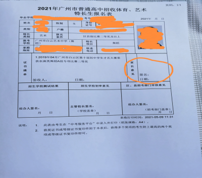 5、用A4纸打印特长生报名表,拿回初中学校盖校章,家长在报名表上“家长意见”这栏写上“同意”并签名