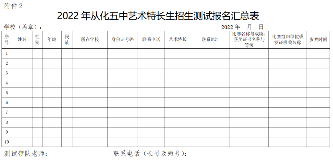 附件2:2022年从化五中艺术特长生招生测试报名汇总表