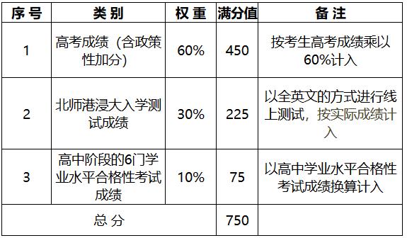 综合评价录取总成绩满分为750分。其中,高考成绩(含政策性加分)按60%的比例计入;北师港浸大入学测试成绩满分为225分,按实际成绩计入;考生高中阶段的思想政治、历史、地理、物理、化学、生物学等6门学业水平合格性考试科目成绩均须达到合格,并按对应等级折算办法计入学业水平合格性考试成绩。