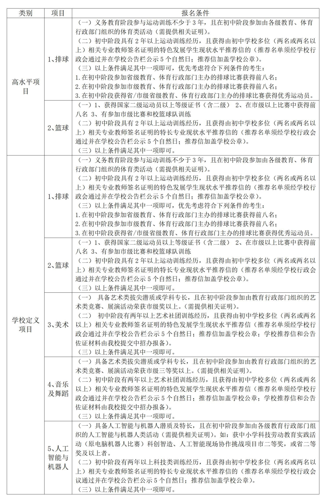 凡符合我市普通高中学校报考条件,且具有学科特长或创新潜质的初三毕业生,可报名参加自主招生。各项目报名要求符合的条件如下: