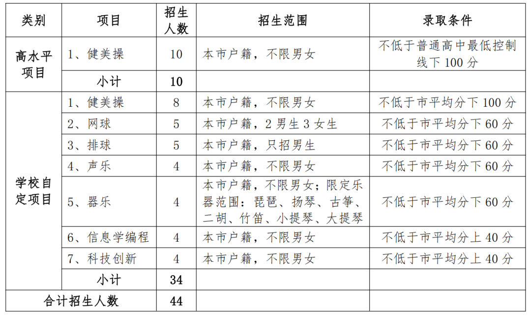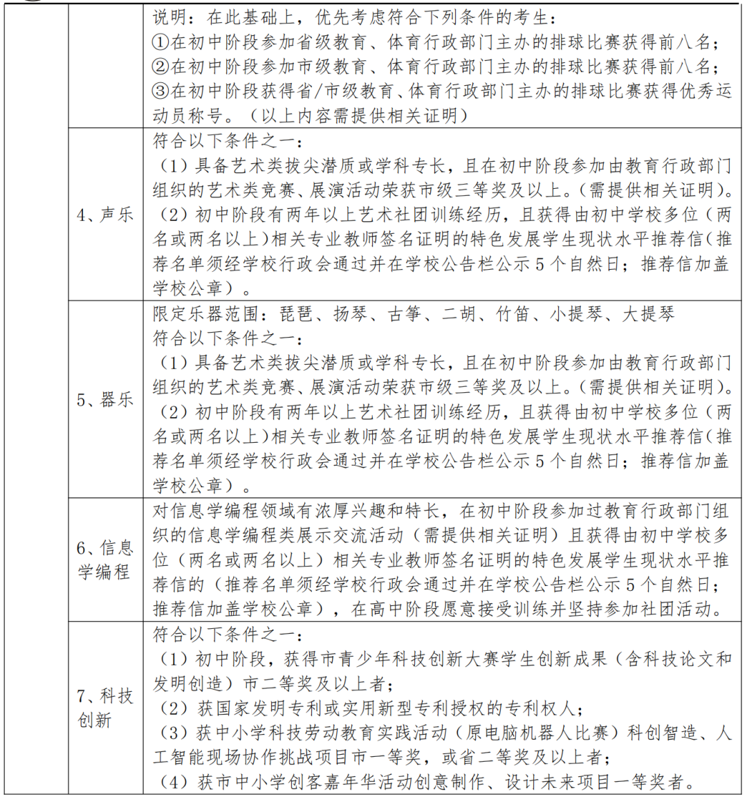 特别提醒:若报名考生数量较多,我校将根据发布的招生方案要求,审核、对比报名资料后对考生的综合条件进行排序,排序靠前的进入校考。资格审核过关(即可以参加校考)的数量,原则上健美操不超过招生计划数的2.5倍(高水平25人、自定项目20人),网球不超过招生计划数的3倍(15人),排球不超过招生计划数的3倍(15人),声乐不超过招生计划数的3倍(12人),器乐不超过招生计划数的3倍(12人),信息学编程不超过招生计划数的3倍(12人),科技创新不超过招生计划数的3倍(12人)。