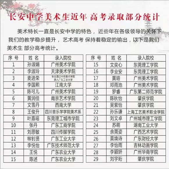 长安中学从2003年起开展音乐特长生高考培养计划,在近20年的教学训练中积累了丰富的高考备考经验。特别是近6年,音乐生的高考本科上线率始终保持在100%。在今年1月份进行的广东省高考音乐联考中,我校高三音乐生专业本科率达到100%,同时,高优率也达到100%!部分学生校考成绩也非常亮眼,入围成绩如下: