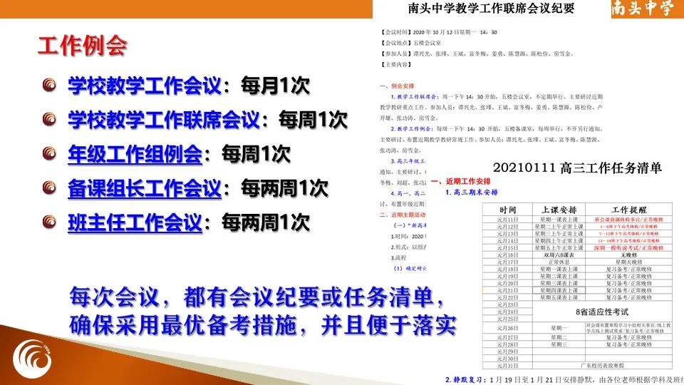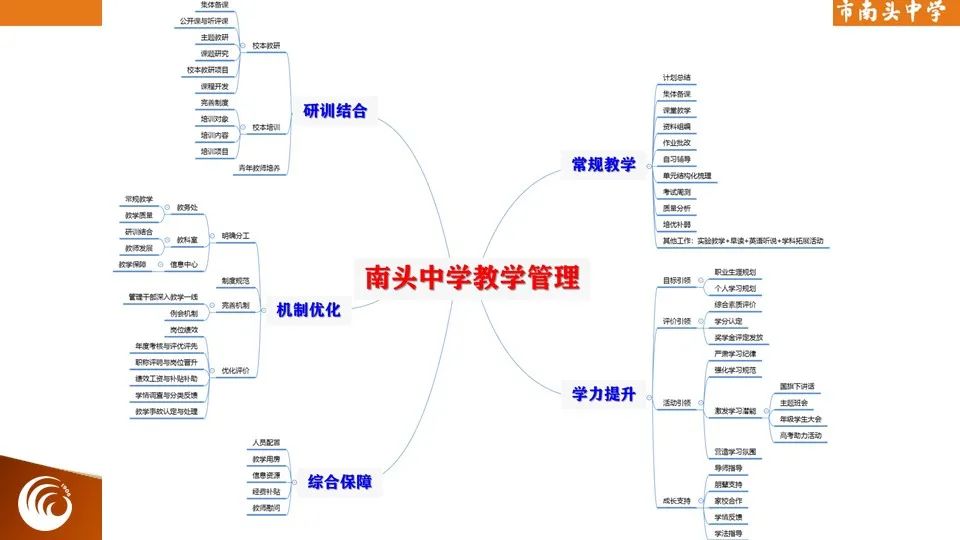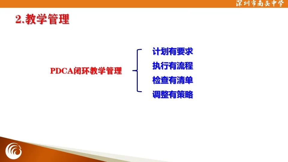 学校实行全流程、精细化的PDCA闭环教学管理,通过目标引领、评价引领、活动引领实现学生主动学习,特别是在集体备课、高质量课堂研讨、凤冈杯课堂教学大赛、单元结构化梳理、教师自编资料、“纽扣计划”初高中衔接、学生奖学金评定、学生职业生涯规划、尖子生一生一案等方面具有鲜明的南中特色。