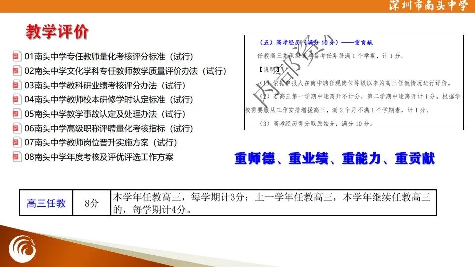 南头中学构建了具有鲜明校本特色的教学评价机制和教师荣誉体系。“重师德、重业绩、重能力、重贡献”的教师评价导向已经深入人心。在南山区学校管理综合评价中,南头中学荣获第1名(全区100家单位),并获得了南山区第五届教育改革创新奖。