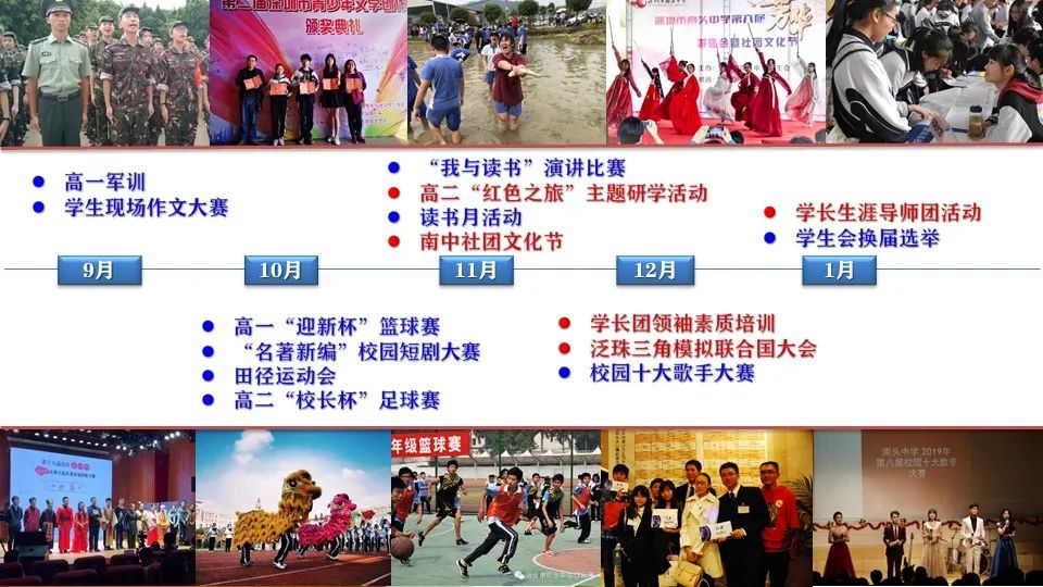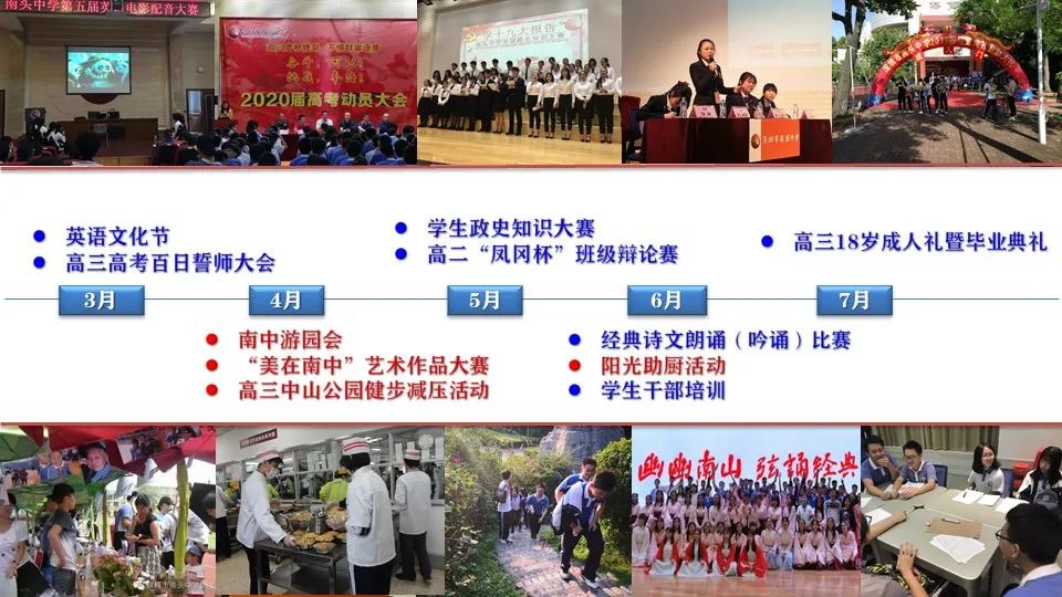 答:学校每年有30多项大型学生活动,其中校庆嘉年华、阳光体育、韶山研学、经典诗文吟诵大赛、天文观测、南中游园会、社团文化节、中山公园健步、学长团培训、校园十大歌手比赛、美在南中设计大赛等已成为独具南中特色的精品学生活动。