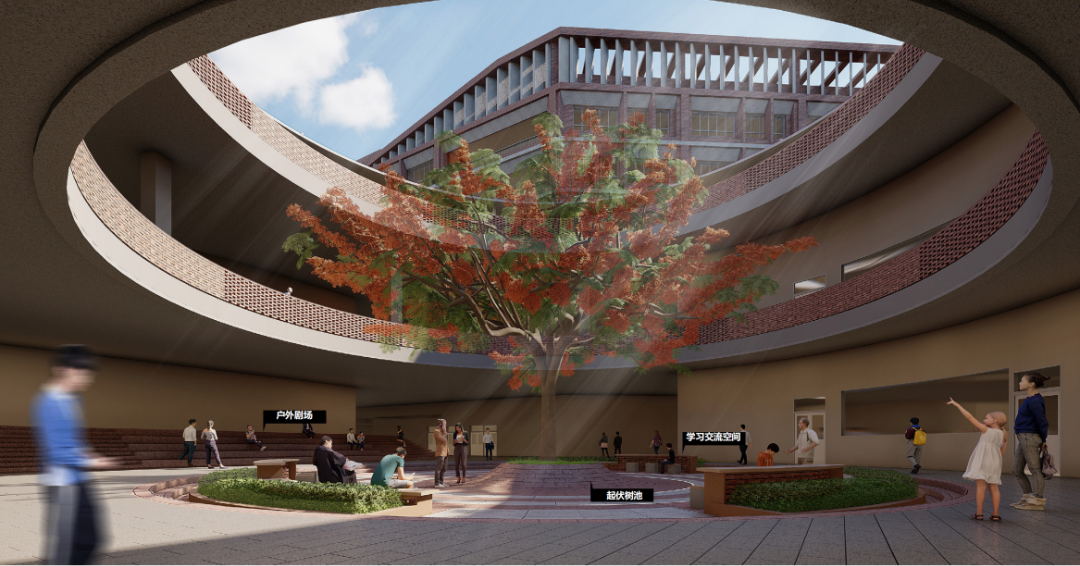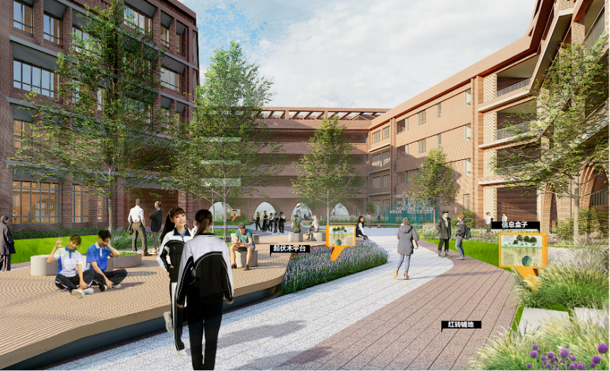 ☞ 学校划分出教学区、实验区、图书馆、生活区等主体区域,空间场所设置丰富,“书香校园”呼之欲出。
