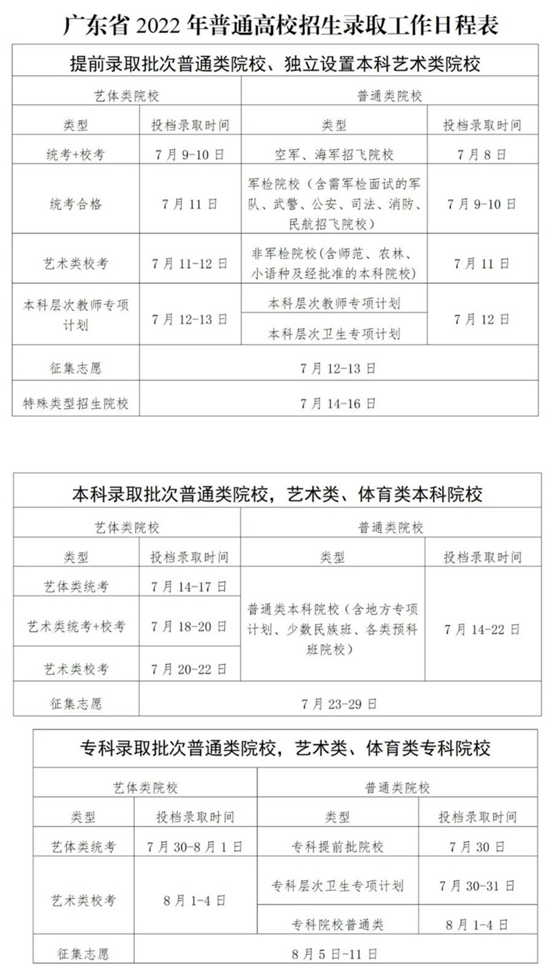 广东省2022年普通高校招生录取工作日程
