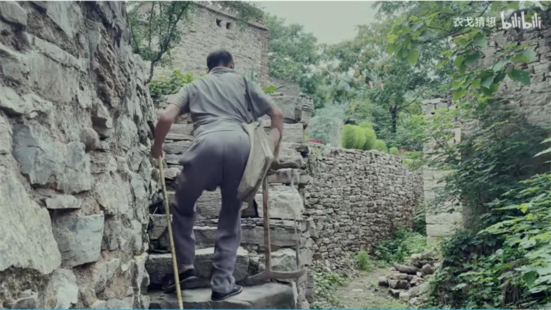 左手拄着木质单拐,右手撑着木匠锯,挎着褪色破洞的安全生产包,这个干瘦的身影,一步一阶、一摇一晃地在村里过了60多年光景。