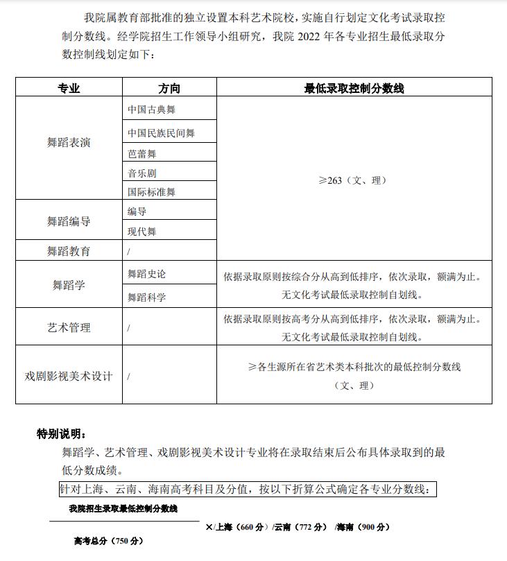 北京舞蹈学院2022年各专业录取最低控制分数线