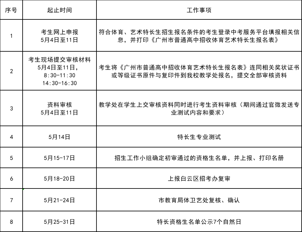 4. 特长生名单公示。在学校公示栏公示拟录取名单,市招考办在广州招考网同时公示体育、艺术特长资格生名单。