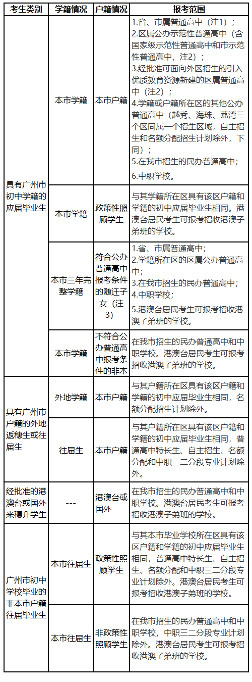 1.省、市属普通高中:华南师范大学附属中学、广东实验中学、广东广雅中学、广州市执信中学、广州市第二中学、广州市第六中学、广州市铁一中学、广州大学附属中学、广州协和学校、广东华侨中学、广州市艺术中学、广州外国语学校、清华附中湾区学校。具体学校名单以《报考指南》为准。