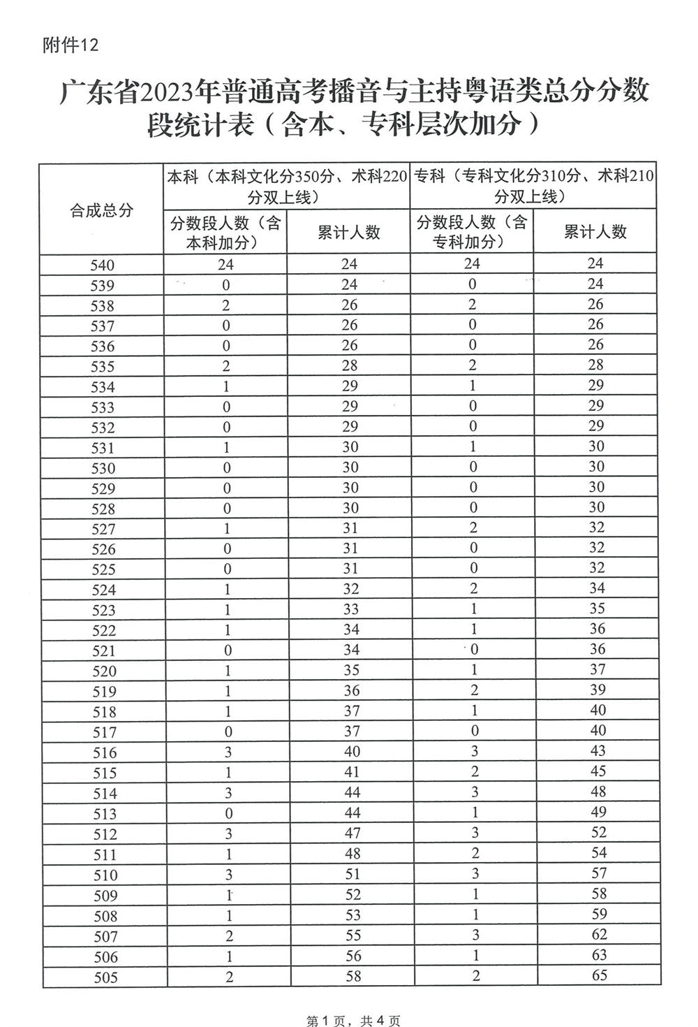 广东省2023年普通高考播音与主持粤语类总分分数段统计表