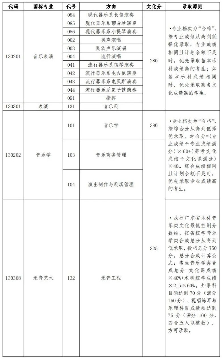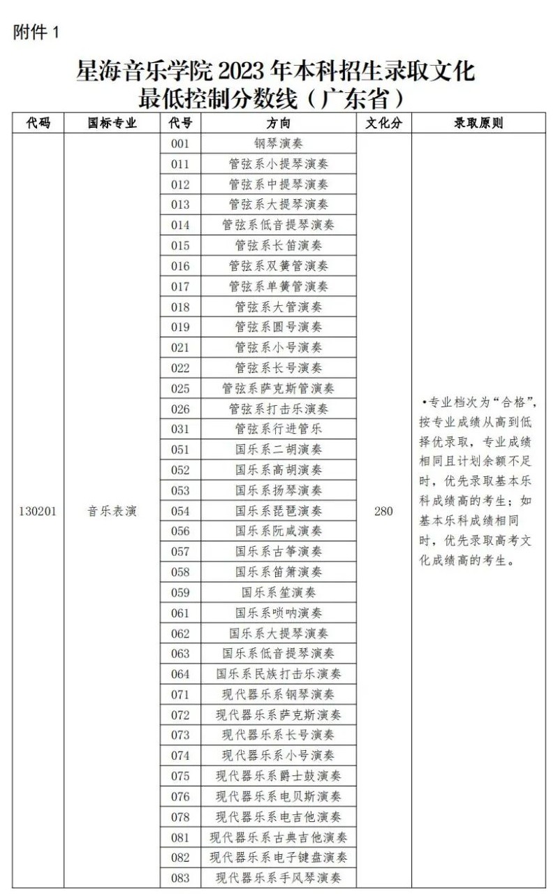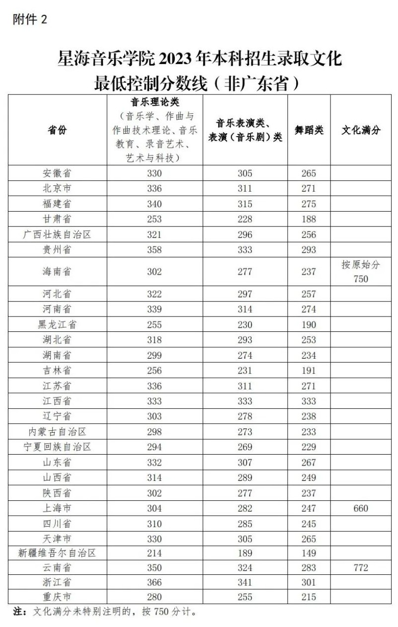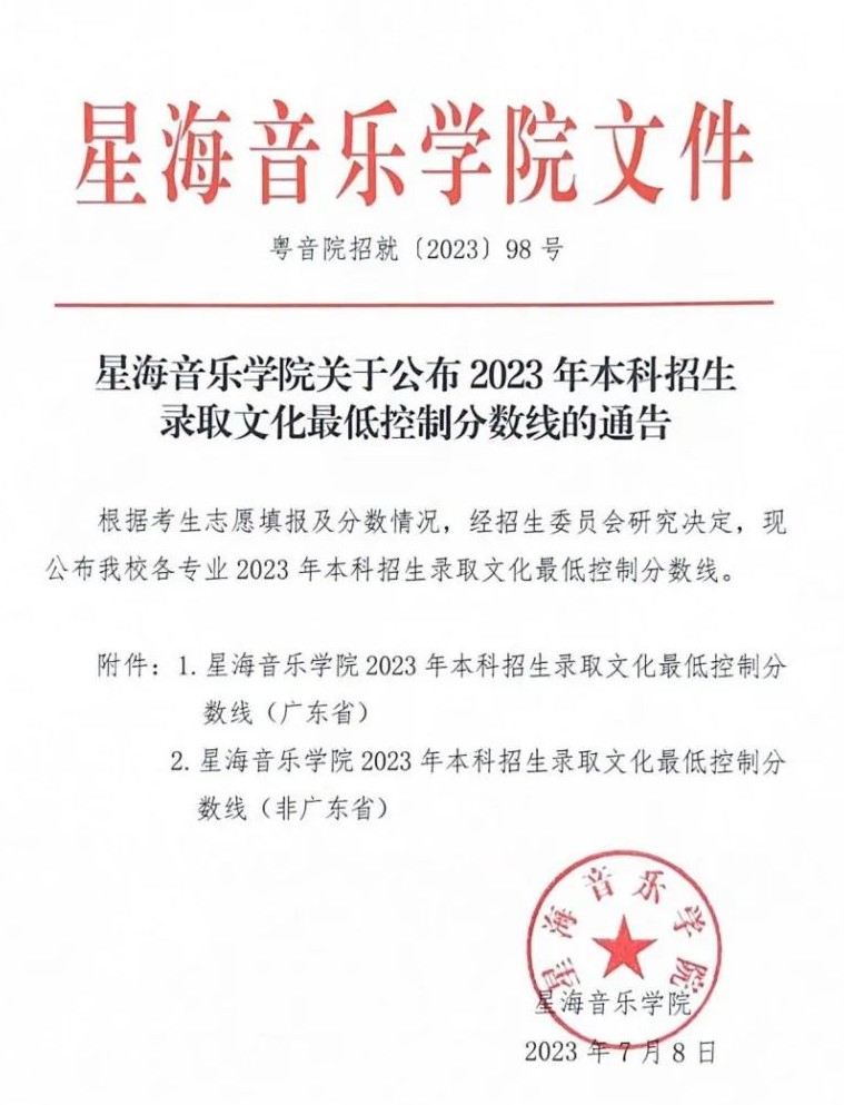 星海音乐学院2023年本科招生录取文化最低控制分数线