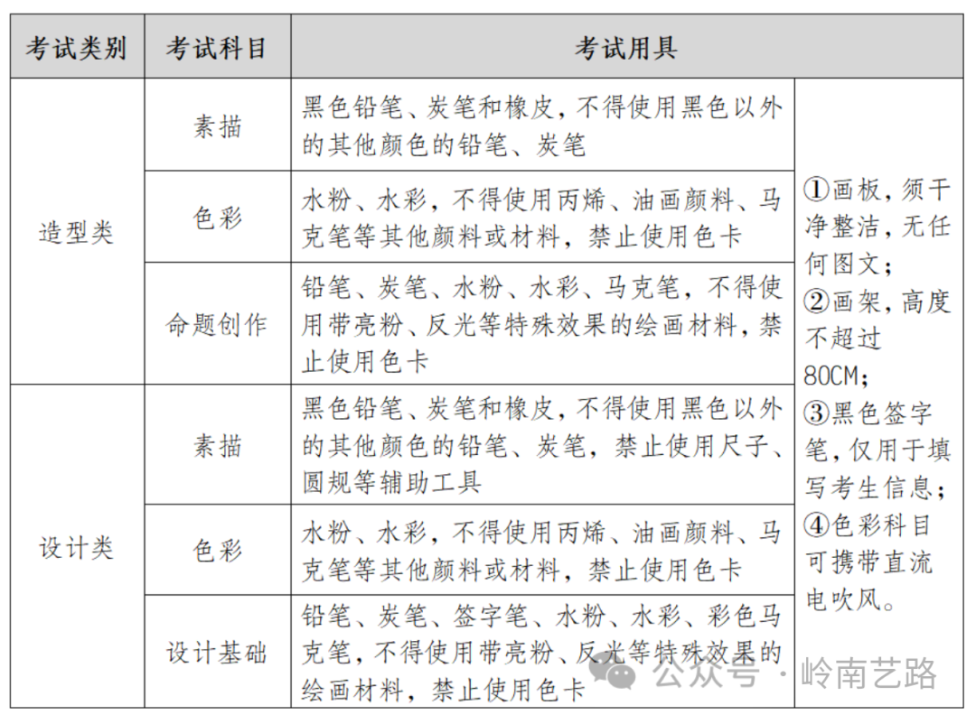 ①铅笔、炭笔、水粉、水彩、马克笔,不得使用带亮粉、反光等特殊效果的绘画材料,禁止使用色卡;