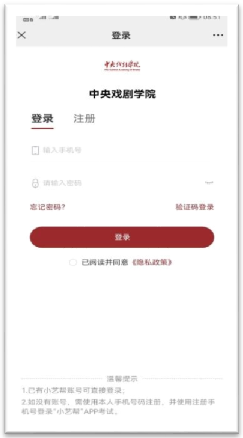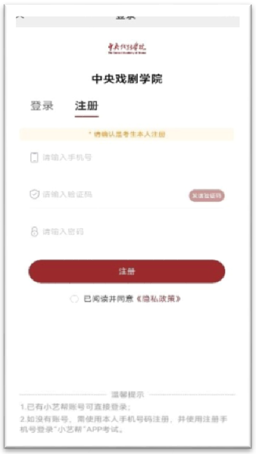 注意:我院线上初试使用“小艺帮”APP,如考生已注册过“小艺帮”账号,请点击“登录”,无须再次注册,直接用已有账号登录即可。