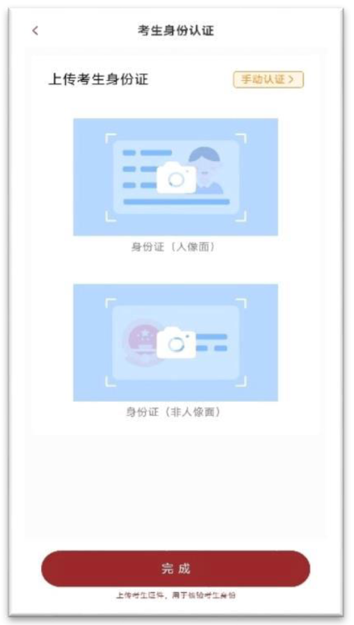 (1)请认证考生提前准备身份证原件或身份证照片正反面,按提示上传身份证人像面和国徽面。