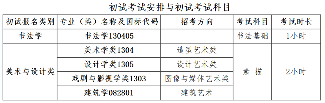 初试:考生可在初试报名类别“中国画”、“书法学”、“美术与设计类”中选择一类报名。其中:“书法学”、“美术与设计类”参加初试,“中国画”专业初试报名后直接进入复试。