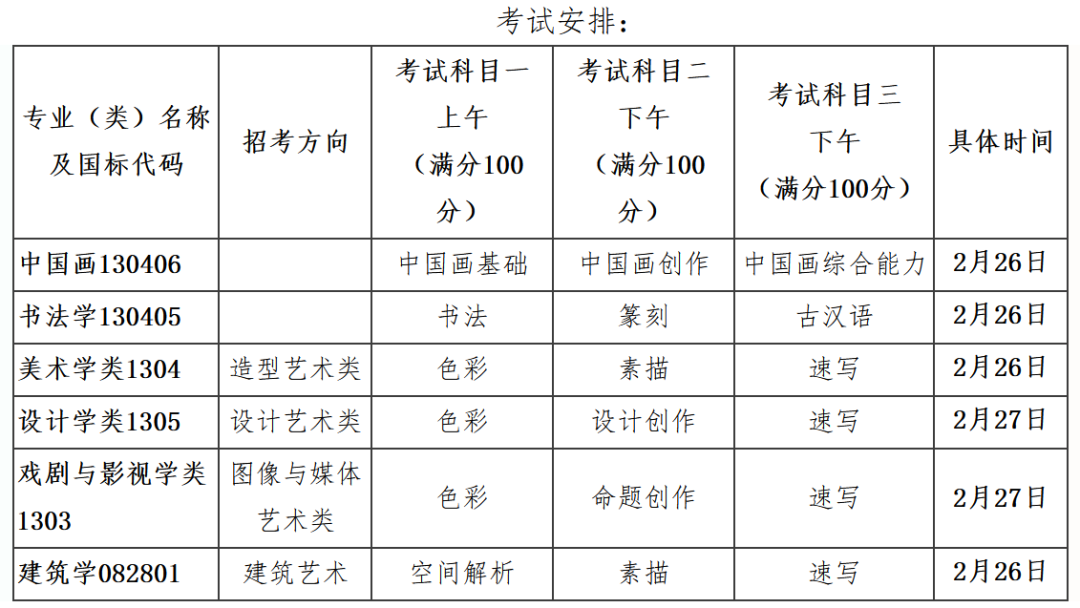 复试:“书法学”专业初试合格考生按书法学专业报名复试;“美术与设计类”初试合格考生只可从“美术学类”、“设计学类”、“戏剧与影视学类”、“建筑学”中选择一个招考专业(类)报名复试,“中国画”专业初试报名考生直接参加中国画专业复试。各招考专业(类)不得兼报。