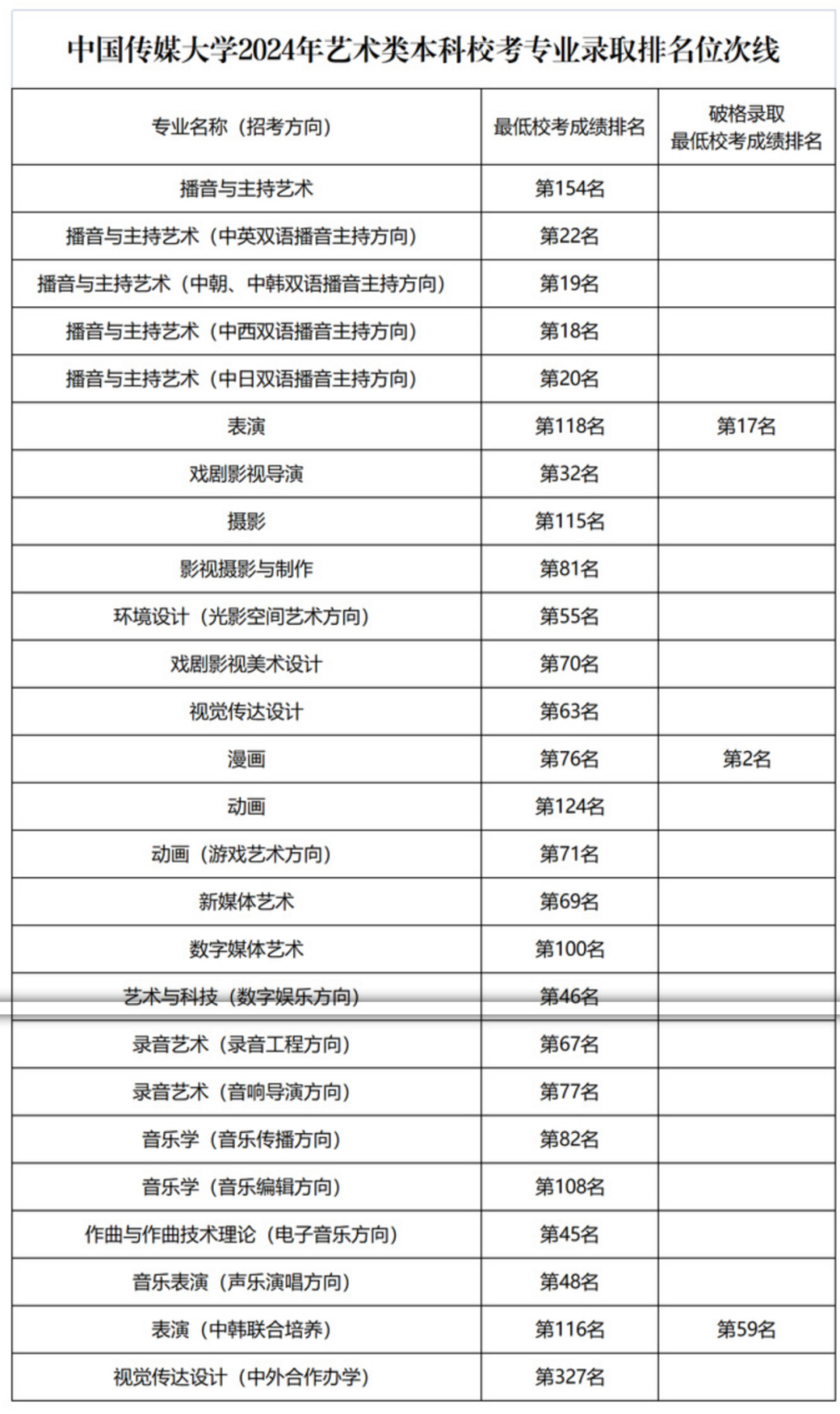 中国传媒大学2024年艺术类本科校考专业录取排名位次线,中国传媒大学2025年录取原则