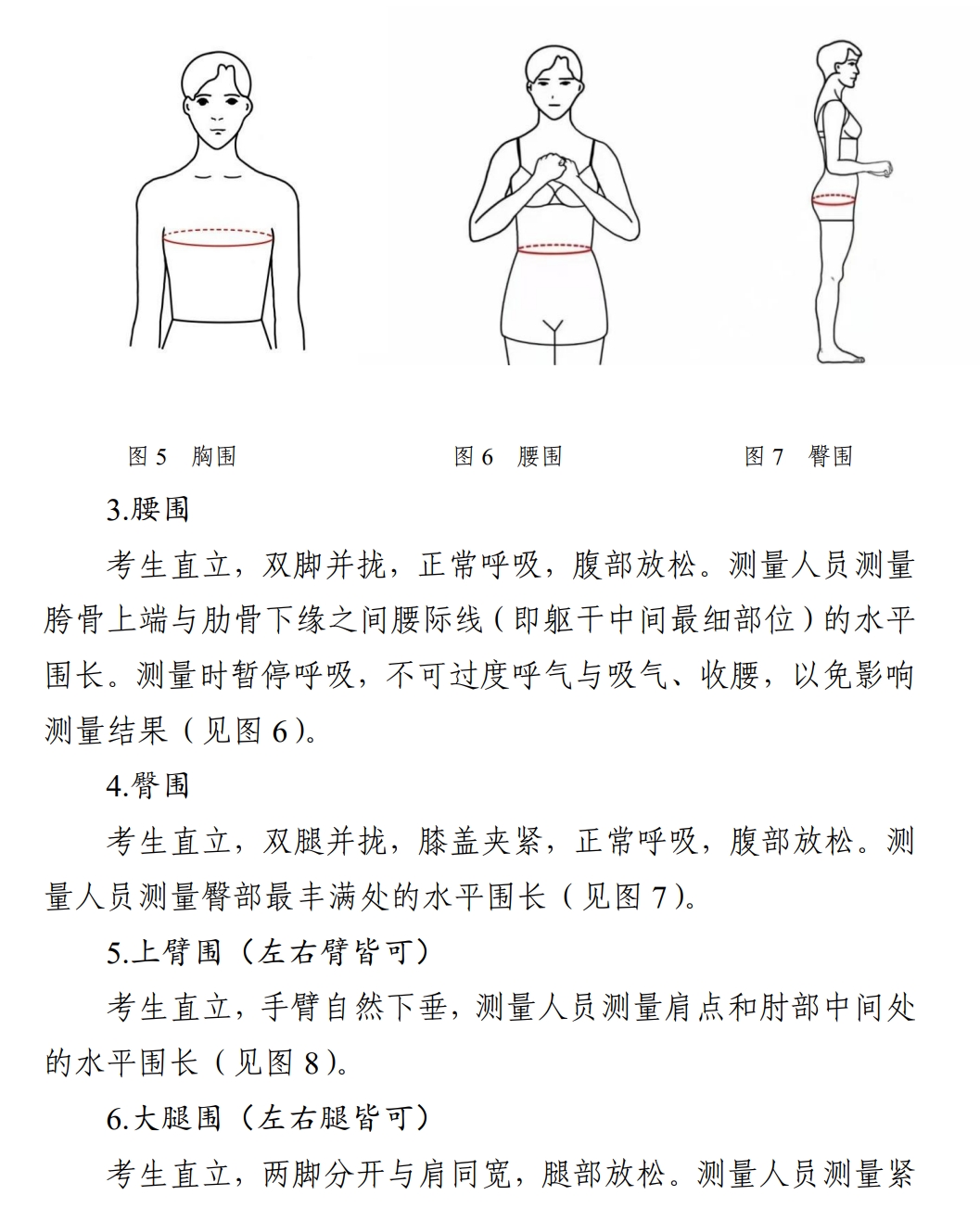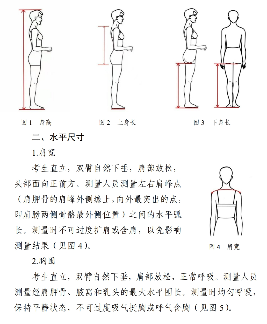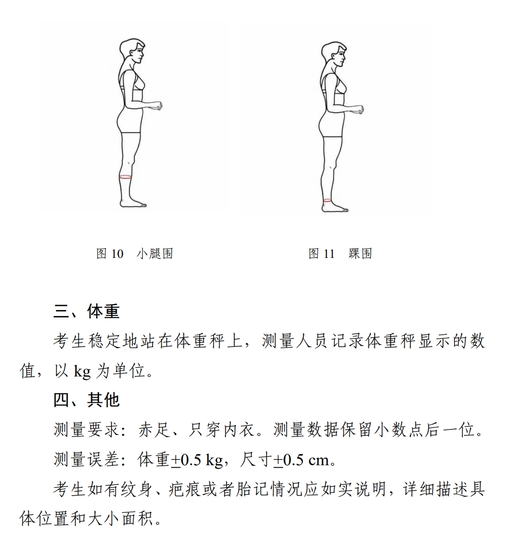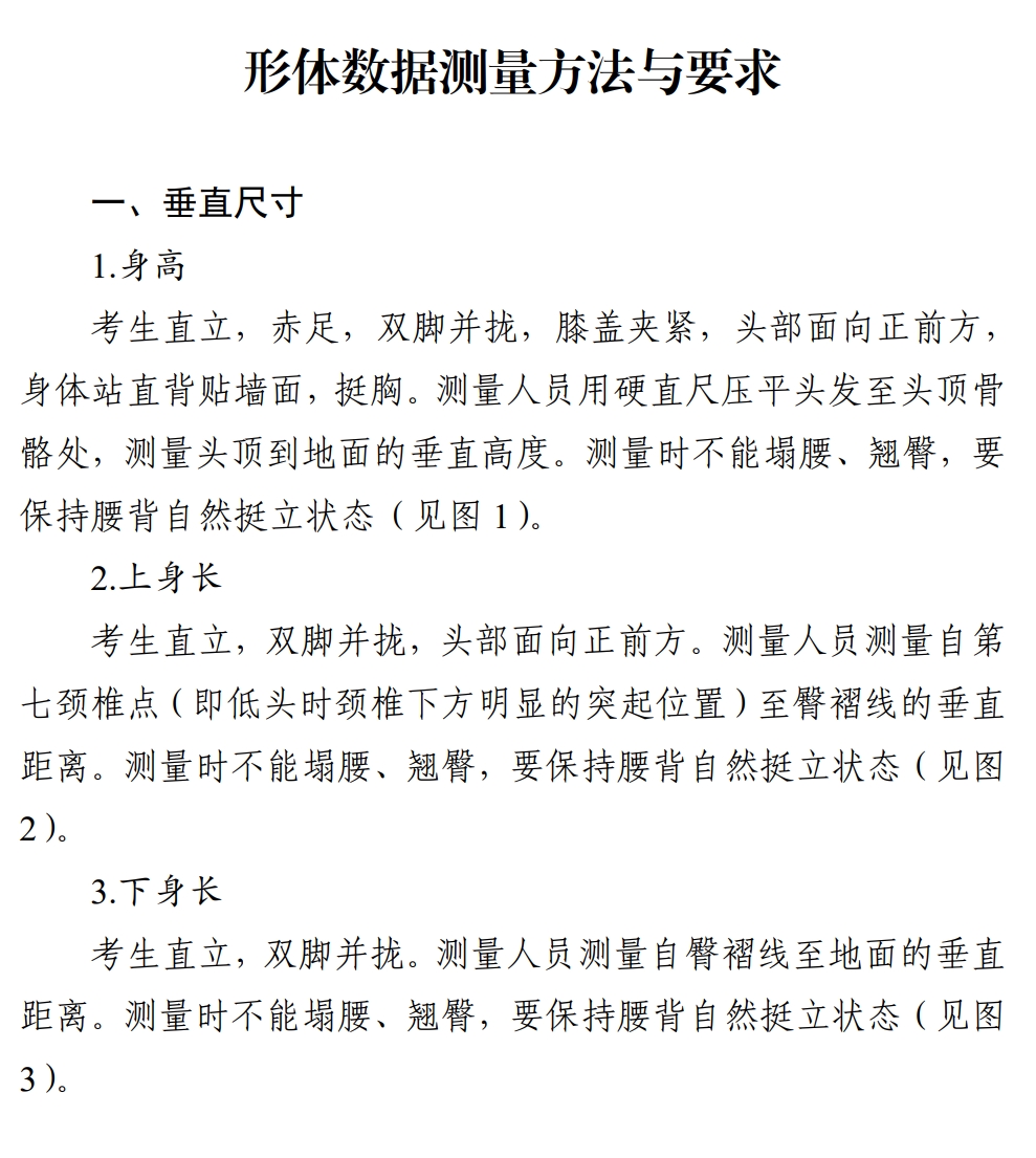 考试形式与要求:考生先完成形体测量(测量方法与要求见附件一),然后面对镜头进行正面、侧面、背面体态展示(展示要求见附件二)。要求赤足、着泳装,其中女生着黑色、分体、不带裙边泳装,男生着黑色泳裤。
