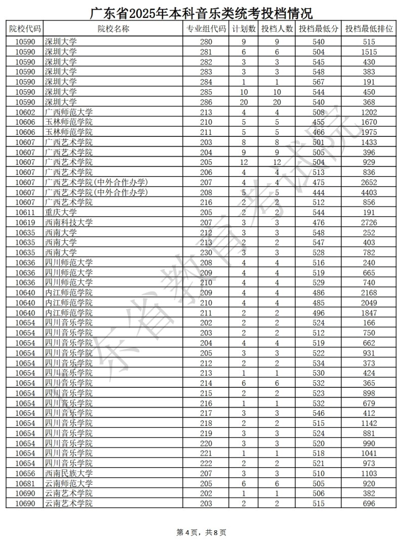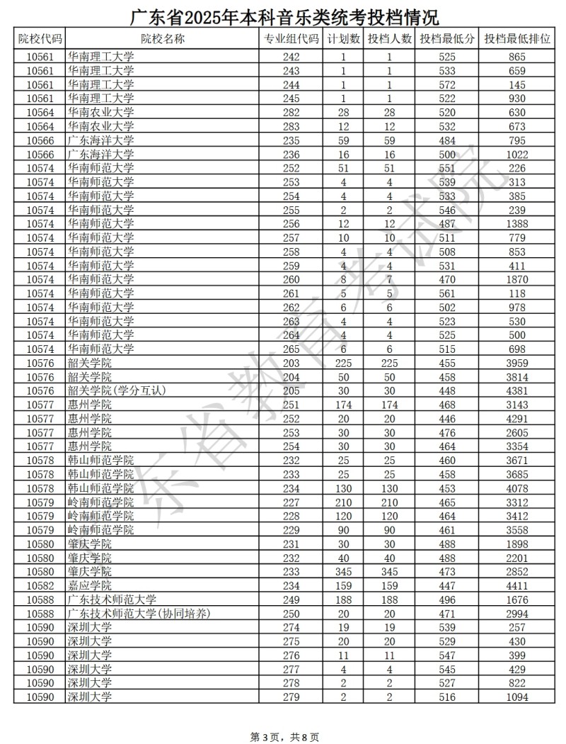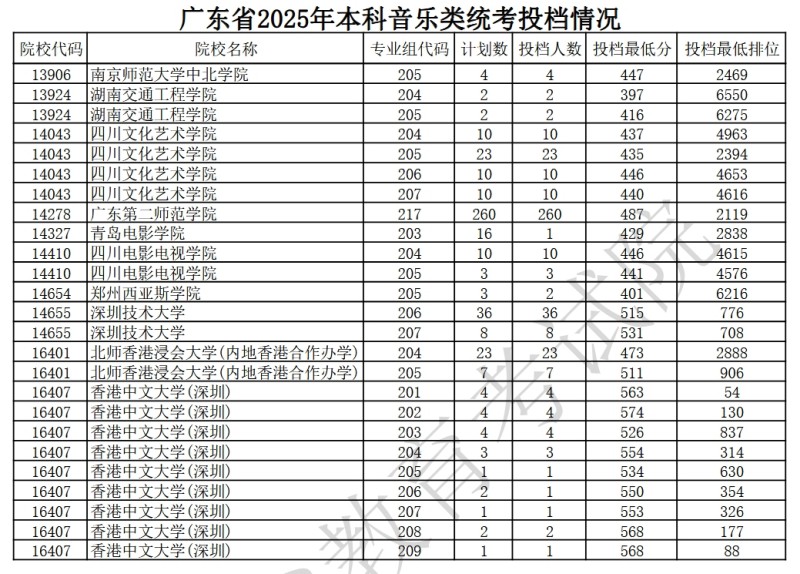 广东省2025年本科音乐类统考投档情况