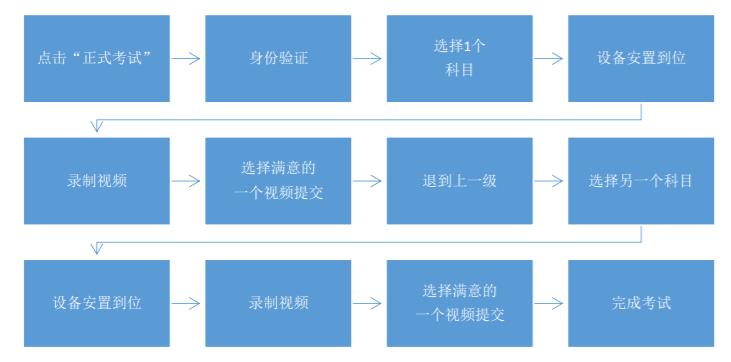 在正式考试的12小时内考生可随时进入考试平台,分别在线录制两个科目的视频,每个科目有2次录制机会,每个视频时限2分钟(不含评述的审题时间)。考生选取满意一段作为最终考试作品上传,提交后不得更换。考试期限结束前,考生务必提交所有科目的视频(包含辅机视频),否则视为弃考。