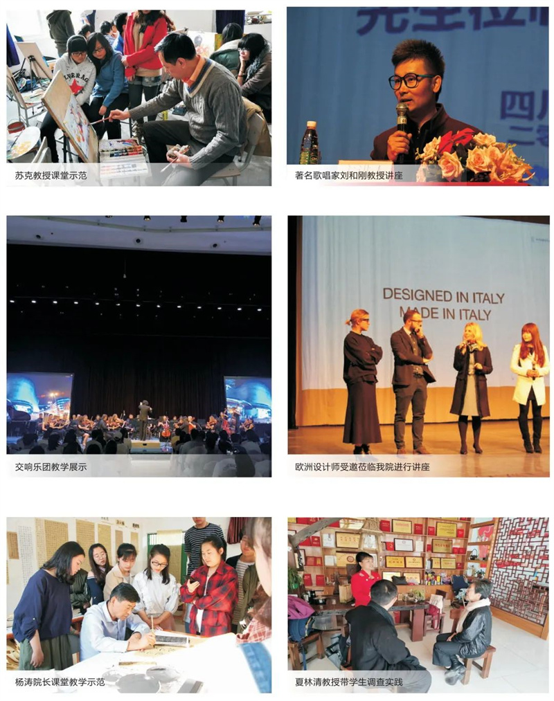 学校现开设本科专业42个、专科专业29个,涵盖艺术学、文学、经济学、管理学、教育学、工学、历史学、法学等8个学科,拥有省级一流本科专业建设点3个。学校设有马克思主义学院、通识教育学院、音乐舞蹈学院、戏剧影视学院、数字传媒学院、美术设计学院、中国书法篆刻学院、经济管理学院、文化旅游学院、文物与博物馆学院、心理与教育学院、继续教育学院共12个二级学院,以及国际学院。建有中国非物质文化遗产研究院、王蒙文学艺术馆、文昌文化研究院、巴蜀石窟乐舞艺术研究院、羌文化保护与发展研究中心、科技艺术研究院、文化艺能与社会心理研究中心等科研机构。