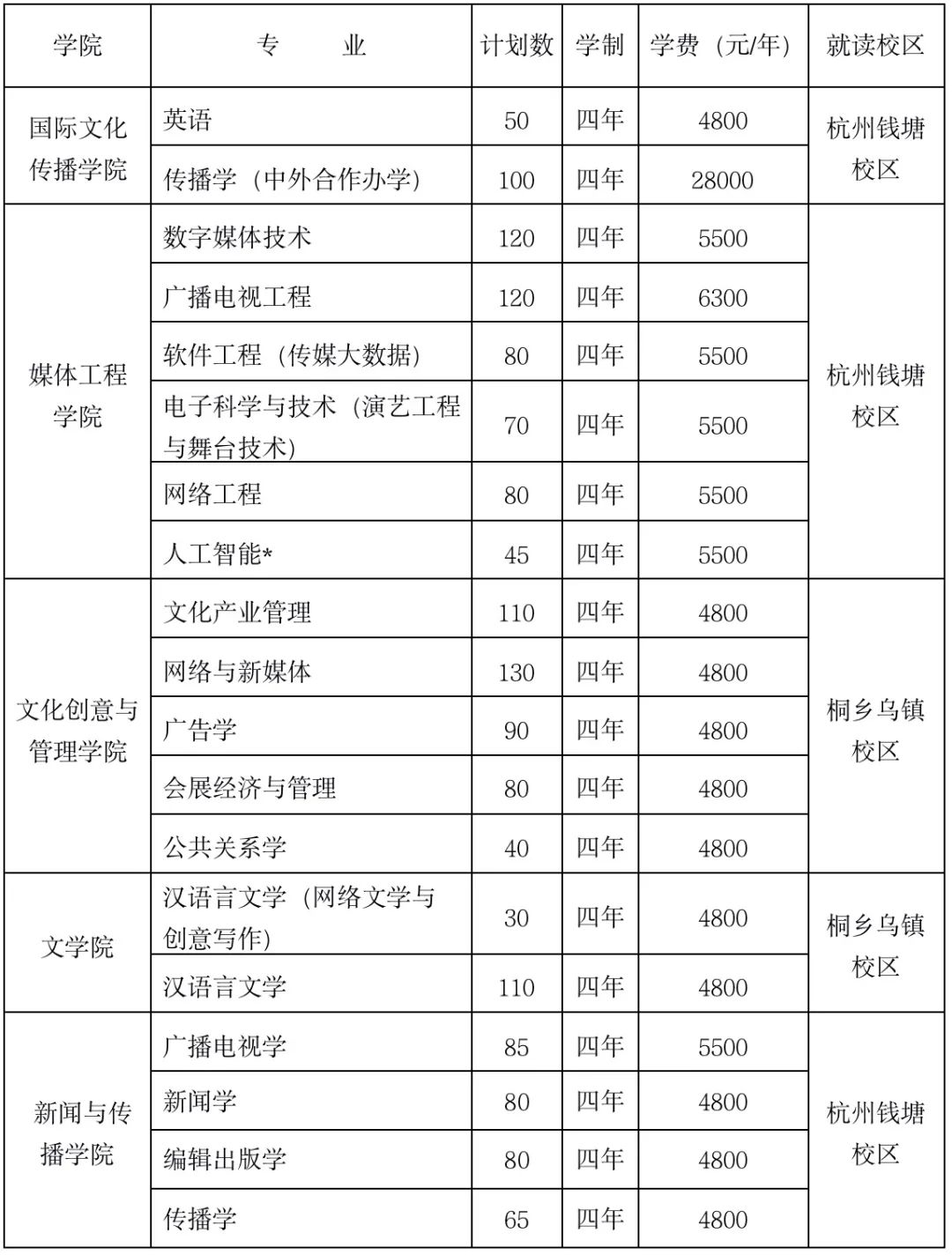 学校现有杭州钱塘和桐乡乌镇两个校区,占地1305亩,总建筑面积64.2万平方米。现有全日制在校研究生、本科生14500余人,教职员工约1400人,拥有教育部“长江学者”特聘教授、国家“万人计划”领军人才、中宣部文化名家暨“四个一批”人才、全国广播电视和网络视听行业人才、教育部“新世纪优秀人才”、全国优秀教师、享受国务院特殊津贴专家等省部级以上人才以及行业高端人才150余人。